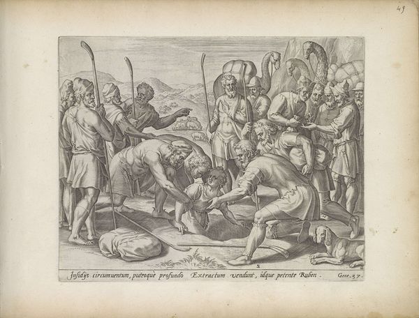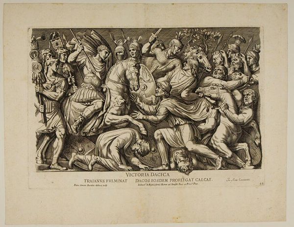 Curator: This etching by Pietro Santi Bartoli, titled "Trojan's Victory over the Dacians," presents a chaotic yet controlled vision of Roman triumph. The work is currently held in the Harvard Art Museums collection. Editor: There's a dense quality to it, a result of the etching process I imagine. But it is also a narrative choice, isn't it? I am sensing a kind of visual overload. Curator: Absolutely. The etching technique, with its precise lines, serves to emphasize the intricate details of armor, the expressions of the figures, and the overall sense of movement. The figures tell of power, civilization, and conquest. Editor: I wonder about the labor involved. The sheer number of lines etched into the plate! But beyond that, what about the social conditions? I see a visual representation of power—Roman dominance rendered in a medium accessible to a wider audience. Curator: It echoes the visual language of Roman power while also participating in the print culture of its own time. The image certainly carries centuries of loaded symbolism related to empire, victory, and subjugation. Editor: Considering it all, I'm left thinking about how materials, in this case ink and paper, become tools for reinforcing narratives of dominance through careful craft. Curator: And I see how the symbolism embedded in this print resonates across history, reminding us how visual culture both reflects and shapes our understanding of power dynamics.