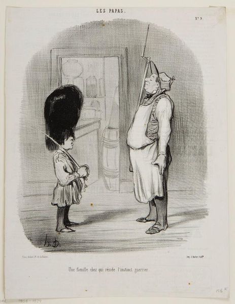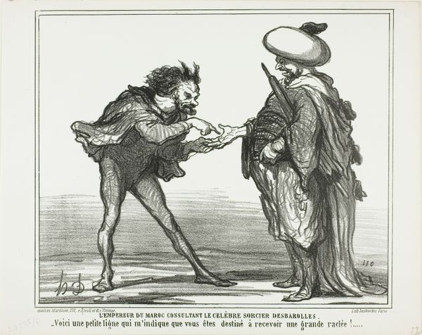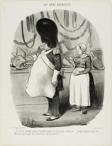 Curator: Honoré Daumier, born in 1808, created this lithograph titled "Yet I can never relax when I see you go out like that..." and it now resides at the Harvard Art Museums. Editor: It's mostly black and white, very linear, and that looming figure on the left is overwhelming everything. Curator: It’s from a series called "Les Bons Bourgeois," offering social commentary, particularly on the anxieties within the bourgeoisie. Editor: The contrast is stark. The heavy figure is a dark mass, visually dominating the worried woman beside him. It's unsettling. Curator: Daumier used lithography as a way to produce caricatures that would appear in newspapers, this was during a period of censorship, so images had power. Editor: The shading does highlight his bulk and the fragility of the woman. The meat hanging in the background gives off a sense of overindulgence. Curator: Indeed, it suggests the unease and perhaps the societal expectations placed upon women during that time. Editor: Thinking about the line work, it does amplify that feeling of stress and anxiety in the composition. Curator: Absolutely, the lines reinforce Daumier's critical view on bourgeois marital relationships. Editor: This image really captures the anxiety, very powerfully, thanks to the technique and form.