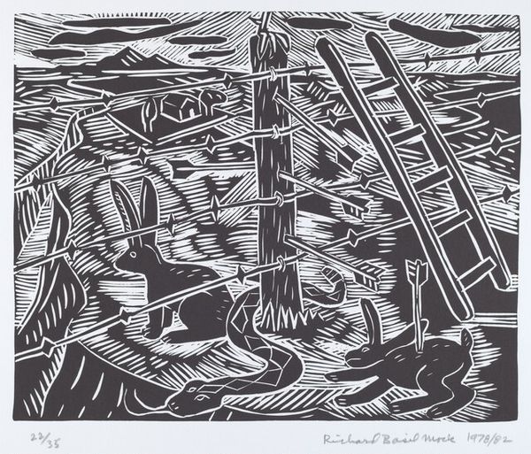 Curator: Schomer Lichtner's 1932 woodcut, "The Collier," is a striking image of a large steamship dominating a busy harbor. Editor: It's the heavy blacks against stark whites that first grab me, giving it this almost oppressive industrial feel. There’s a definite unease in the angular lines. Curator: Absolutely, the high contrast typical of woodcut printing emphasizes the sheer bulk of the materials depicted: metal, water, and stone. Consider the labor involved not just in the ship, but in quarrying those city blocks rendered in the background. Editor: It also brings into sharp focus questions about class and labor during the Depression era. The collier represents the working class, right? But is Lichtner glorifying this labor or commenting on the worker's alienation within this industrialized landscape? Curator: Lichtner was deeply concerned with reflecting social realities. We need to remember the materiality here, the wood itself, likely locally sourced, and the repetitive physical action of carving, mirroring the cyclical nature of the work performed by the depicted laborer. Editor: The limited perspective emphasizes that overwhelming sense of scale, the individual dwarfed by the machines of industry. There's very little sky; our viewpoint is from the level of the water, suggesting a proximity to—almost immersion in—the physical realities of this world. Curator: The deliberate and time-consuming nature of woodcut as a process also demands a certain slowing down. It's not a quick sketch; the artist clearly has engaged with and pondered the forms present. It demands our attention, urging us to truly consider the making as much as the subject itself. Editor: That act of "slowing down" that you mention could itself be interpreted as a kind of resistance against the ever-increasing pace of industrialization. The print serves as a kind of visual anchor, calling us to analyze our own relationship with that progress. Curator: Considering "The Collier", I’m drawn back to its direct connection with labor through its own meticulous production, offering insight to the tangible, material processes underpinning modern life. Editor: I see "The Collier" as an entry point to reflecting on labor conditions then and now, inviting a more thoughtful investigation into our collective narrative with labor, and its legacy, so deeply rooted in our society.