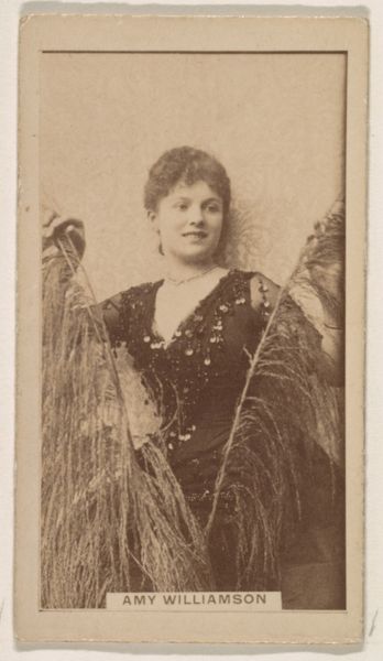 This is "Amy Williamson," a promotional card from the Actors and Actresses series by W. Duke, Sons & Co., printed around 1888. The sepia tone suffuses the image, creating a muted, dreamlike quality. The composition is strikingly simple, with the actress positioned centrally. A cascade of feathered plumes frames Williamson, adding dynamism and depth. The feathers, rendered with fine lines, introduce an element of texture that contrasts with her softly focused features. Her gaze, directed slightly off-center, suggests a narrative beyond the frame. The use of sepia flattens the image, drawing attention to the linear quality of the feathers and the tonal variations in her attire. As a commercial product, the card’s aesthetic choices reveal a tension between artistic representation and market appeal. This blend of artistry and commerce challenges established notions of value and authorship. As such, the card serves as a material signifier of late 19th-century cultural values.