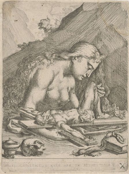 Editor: This is Sebald Beham's "Eve", a small engraving. The density of lines creating shadows and form is striking. What can you tell me about the composition? Curator: The formal arrangement guides our reading: notice the tonal contrast. The artist has achieved considerable depth through a consistent and controlled cross-hatching technique. Observe how the rendering of the landscape and sky contrasts with the darkness of the tree where the serpent resides. Editor: So the light and dark are not just descriptive, but compositional? Curator: Precisely. Light emphasizes Eve and the implied narrative tension with the serpent, while darkness creates an ominous feeling. What do you make of the positioning of her figure? Editor: I see how she is almost forced into the foreground. Thank you, that clarified so much. Curator: Indeed, this close visual reading reveals Beham's mastery of form and technique.