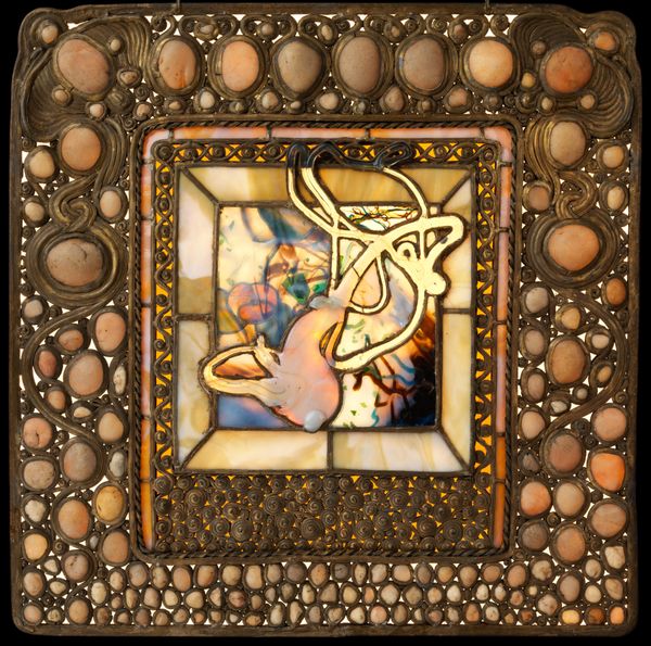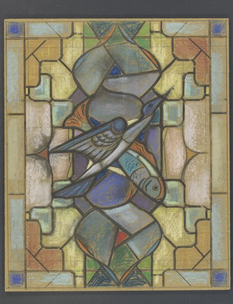 Editor: This striking stained-glass piece is "Vierkante ruit met in het midden een ronde ruit in geel en donkerbruin" by Jacoba van Heemskerck, created sometime after 1918. It’s currently held at the Rijksmuseum. The patterns feel so… geometric and almost tribal. What do you see in this work, beyond the obvious patterns? Curator: Beyond the immediate visual impact, I see a profound exploration of abstraction and its intersection with early 20th-century anxieties. Van Heemskerck, working in a period defined by the trauma of the First World War and the rise of industrialization, engages in a visual dialogue about the search for order amidst chaos. Consider the interplay of the rigid square and the dynamic circle: might this reflect tensions between the established societal structures and the burgeoning desire for change and renewal? Editor: That’s an interesting perspective. I was mainly focused on the abstract nature of the piece and hadn't considered how historical context might contribute to a reading of her choices. Curator: The abstraction isn't devoid of meaning, though. Notice the layering of patterns, especially the repetition of triangles, squares and curvilinear elements. In the context of early modernism and a male dominated art world, do you read a particular challenge to, or even subversion of, traditional notions of femininity in such seemingly simple compositions? How do these abstract patterns, through their deliberate arrangement and colour choices, resonate with emerging theories of psychology and perception gaining traction in Europe? Editor: Now I’m considering the overall organization of the composition, including Van Heemskerck as a woman within these artistic trends. It definitely adds another layer to how I perceive her decisions. It also gives depth to the simple interplay. Curator: Precisely. Art is never created in a vacuum. Considering the artwork's socio-political landscape deepens our appreciation. I leave this artwork pondering how social anxiety can manifest itself within such striking color patterns.