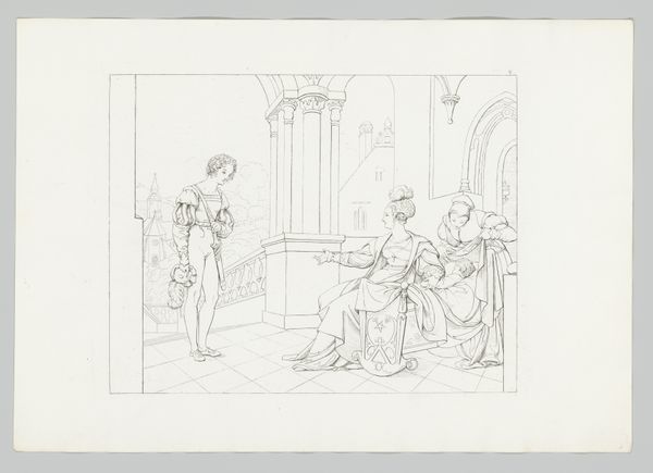 Moritz Retzsch made this sketch, titled "Young Man Introduced by an Older Man to a Young Woman with Child," using graphite on paper. It explores themes of courtship and family within a specific social milieu. Consider the visual codes at play here. The architectural setting, dress, and body language all point to a narrative deeply embedded in the social customs of its time. Likely made in Germany in the 19th century, the drawing provides insight into the social expectations surrounding marriage and lineage within the middle and upper classes. The composition reinforces these ideas by positioning the older man as a mediator in the introduction, emphasizing the importance of familial approval and social standing in the matchmaking process. To fully understand Retzsch’s drawing, we can consult historical records, fashion plates, and etiquette manuals from the period. These resources will allow us to appreciate art as a reflection of social and institutional norms.