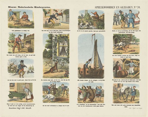 This print, made by George Lodewijk Funke, presents a mosaic of Dutch proverbs and sayings, each tableau rich with symbolic meaning. Take, for example, the image of the fox. The fox has long been a symbol of cunning and deception, a trait recognized across cultures from Aesop's fables to Germanic folklore. Note how in this depiction, the fox lurks near a window, suggesting a hidden agenda. This resonates with the animal's frequent portrayal in art as a trickster, a figure that embodies the darker aspects of human nature. Consider how, even in contemporary media, the fox often retains this association with cleverness, often used to express hidden desires. The cyclical nature of these symbols reveals how cultural memory operates. These proverbs, visually encoded, connect us to past generations, echoing through time and reminding us of the enduring wisdom and follies of humanity.