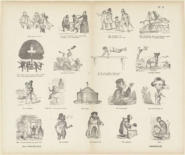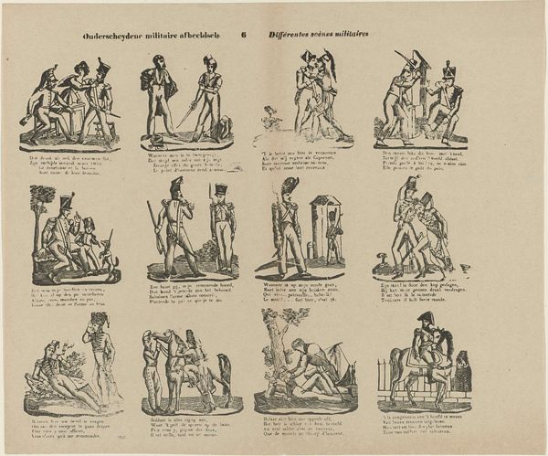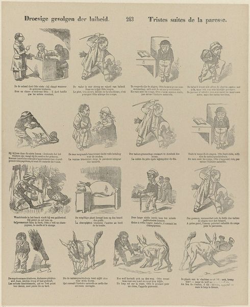 This lithograph was created by Albertus Willem Sijthoff, sometime in the 19th century. It's a page of 'New Dutch Children's Prints' - small scenes accompanied by didactic rhymes. The print offers a glimpse into the values and social expectations of children during that era. We see vignettes that range from admonitions to playful scenarios, each designed to impart a moral lesson or convey a certain worldview. There's a tension visible in these images, a negotiation between the innocence of childhood and the imposition of adult norms. The rhymes, with their folksy language, attempt to bridge this gap, to make instruction seem like entertainment. I wonder about the children who first encountered these prints. How did they internalize these lessons? Did they resist or reimagine these narratives in their own ways? This print is not merely a quaint artifact; it's a window into a world where childhood was carefully curated and innocence was a battleground for shaping future citizens.