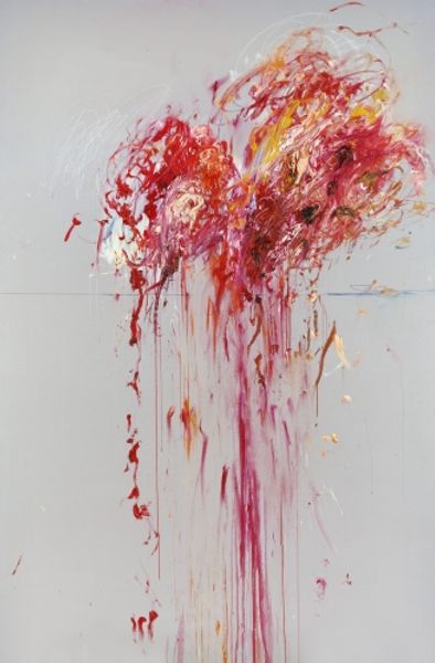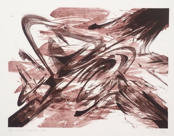 Curator: Well, isn't that striking. Immediately, I'm drawn into its bold, almost joyful quality. There's something wonderfully unfettered about the way the red is laid down. Editor: It is quite gestural, isn't it? Here we have "Happiness, red" by Kazuaki Tanahashi, an acrylic on canvas that leans heavily into abstract expressionism. You can see the thick impasto and vigorous brushwork, almost like the application itself is the subject. Curator: I love that, application *as* subject. It does make you wonder about the labour, the physical act of creating this. Were they angry? Impassioned? I almost feel a flicker of fury along with the joy. It’s intriguing. Editor: The material processes really emphasize the artist’s intention here. Abstraction allows the viewer to really grapple with the visceral impact of the acrylic and gestural strokes on the canvas. Consider too the potential relationship between the "happiness" of the title and red paint itself: the color has many strong, potentially contradictory cultural meanings. Curator: Contradictory indeed. A child's fire engine and blood spilt both shout in red. Is Tanahashi thinking about how something joyous and alive can, in a heartbeat, transform into something potent with a dark undertow? Maybe a reflection of how precarious joy can be. Editor: Precisely. Red signals life, warning, and love—it's no accident that it's used so prominently across art and industrial design, carrying layered social associations with it. By titling this piece “Happiness, red”, Tanahashi points to those very tensions and invites our own engagement with materiality and interpretation. Curator: Which leaves you pondering it long after you leave the room, right? A burst of sunshine... tinged with just enough shadow to keep you grounded. That’s… happiness, perhaps. Editor: Yes, a potent reminder of the weight and possibilities of that loaded word.