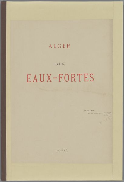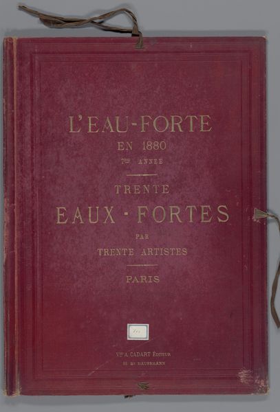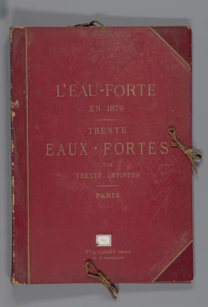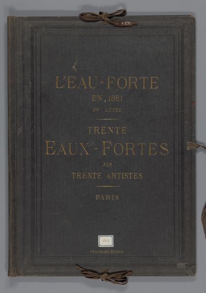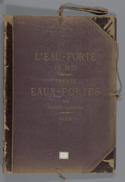 Curator: Here we have the cover for a collection of etchings from 1876, entitled "Omslag voor 23 prenten met landschappen, stadsgezichten en figuren en 8 tekstbladen" created by the studio of Weduwe Alfred Cadart. It resides here at the Rijksmuseum. Editor: It’s rather unassuming, isn’t it? The subdued palette and simple typography evoke a sense of established tradition, of something valued and carefully preserved. Curator: Indeed. Consider the composition—the vertical orientation, the central alignment of the text, and the almost perfectly symmetrical placement. These design elements lend a sense of formality, appropriate for its time and function as a compilation album of landscapes, cityscapes and figure studies. Editor: I notice the recurring motif of "thirty." The title specifies that the album contains thirty etchings from thirty different artists in Paris. What does this tell us about artistic community at that time? Were they trying to reflect some unity between artists? Curator: The "L’Eau-Forte" translates to "Etching" a fitting claim to truth considering that etching held cultural value. It can also be seen as a way to promote up-and-coming etchers. In terms of design and cultural references, it's hard to escape. Editor: Those cord fastenings remind me of keepsakes tied with ribbon, promising to protect the fragile art held within. What can you say about its function? Curator: Its functionality stems from being designed as a book cover, that it served as not just a covering, but it was itself to act as art to present the contents inside. Editor: It appears a time capsule capturing Parisian artistic endeavor from 1876 through one studio. I almost get the sense that this book cover functions as its own symbolic cityscape! Curator: Interesting observation! That is what I feel art really tries to encapsulate through design, to promote something so people are moved to look. Editor: So ultimately we end with the symbolic landscape of art within society and to find what it communicates today. Curator: Exactly. An impressive album reflecting the zeitgeist, a moment in time.
