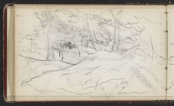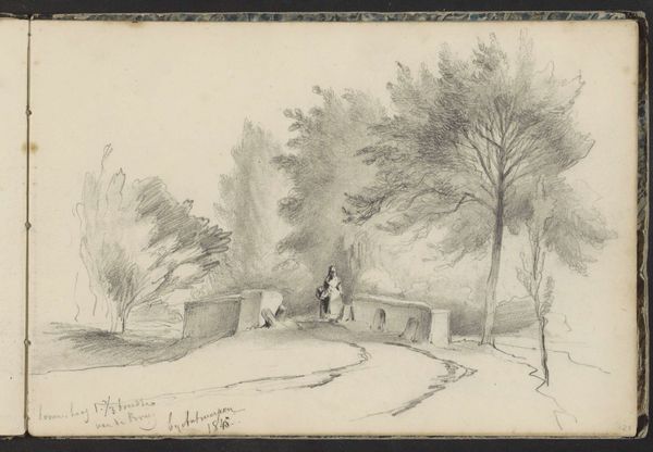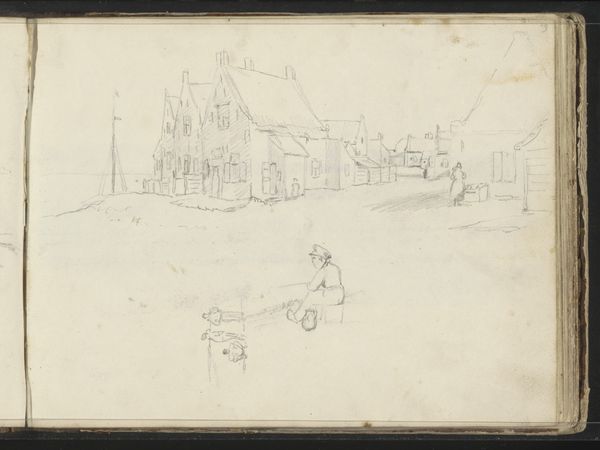Curator: We’re looking at Ferdinand Oldewelt’s pencil drawing, "Erf te Laren," made sometime between 1908 and 1923. What strikes you first? Editor: The rawness of it, that very immediacy. The visible pencil strokes sketching out forms, nothing is hidden. It feels incomplete yet very satisfying, with its muted tone. The way the textures emerge primarily from the layering and direction of lines intrigues me. Curator: And those textures evoke something, don't they? Oldewelt’s Laren, a village with deep ties to the Dutch Golden Age, became a haven for artists seeking a connection with the past. There is an enduring connection to the land represented here, in almost meditative reflection of nature's permanence. Editor: The landscape, depicted here, suggests the essence of rural Dutch life. It's about more than just accurately rendering a place; it is a statement on space and visual organization that invites consideration of how the parts build to an expressive, cohesive whole. How interesting, also, the house as a symbol… a traditional form drawn so starkly with little details, it reduces architecture to archetype. Curator: Precisely! The cottage, sturdy but simple, anchors the image—it’s almost archetypal in its representation of home and heritage, against which the ethereal nature seems almost overpowering, hinting at our insignificance. Then there are those figures sitting outside: timeless witnesses within this rural drama. Do they suggest a memory of past inhabitants, present lives, or enduring customs? Editor: They also establish a narrative—suggesting scale and a kind of unassuming peaceful existence that contrasts starkly against modernity. Note how subtly Oldewelt handles the composition: the figures draw you to the horizon line but then pull you to ponder that fascinating convergence of lines into an expressionistic effect. Curator: It offers a sense of tranquility rooted in simplicity, perhaps calling to mind familiar aspects of country life that withstand fleeting historical moments, acting as a reminder of origins. Editor: It does, it truly does. What began as what appears a sketch unravels a world to consider—all in a few well-placed lines. Curator: Indeed. I am drawn back to Oldewelt’s world and a lasting sense of connectedness.