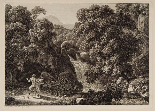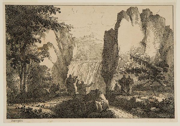 Curator: This is Christian Wilhelm Ernst Dietrich's "Waterfall at Tivoli," housed here at the Harvard Art Museums. Editor: It’s quite dramatic, isn’t it? The stark contrasts and dense composition create a sense of overwhelming natural power. Curator: Indeed. Note how Dietrich employs intricate line work to delineate form and texture. The varying densities create an illusion of depth and mass. Editor: The landscape is undeniably romanticized, but I wonder about the social reality it obscures. Who truly benefited from these idyllic scenes during Dietrich's time? What about marginalized communities? Curator: A valid point, and yet, one could also argue that the artist's focus on the sublime power of nature offers a commentary on the human condition. Editor: Perhaps. But I find myself drawn to thinking about who had the privilege to contemplate such scenes—and who did not. Curator: It's a testament to art's enduring ability to provoke diverse interpretations and conversations. Editor: Absolutely. A reminder that art history is never a closed book, but always open to revision.