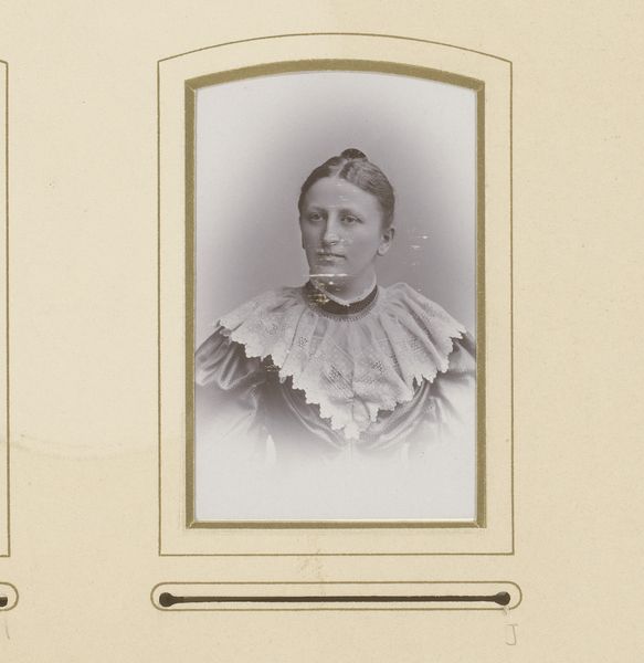 Curator: Here we have a portrait of a young woman dating from between 1889 and 1900. The work, whose creator we believe to be Louis Sauvager, is an albumen print. Editor: There’s a softness to it, a gentle fade, almost dreamlike. The way the lace collar and sleeves stand out suggests hours, if not days, of meticulous handwork. Curator: Indeed, the choice of albumen printing was crucial then. The process, involving egg whites, allowed for incredibly fine detail and a wide tonal range that was favored in portraiture at the time. Editor: Knowing it's an albumen print adds to its aura. This was no instantaneous click; it required craft, chemicals, light exposure, multiple stages of intervention. Curator: Absolutely, we must consider photography's social function in this era. These portraits weren’t just images; they represented status and carefully constructed self-presentation. Editor: I agree. The photograph serves as more than just a pretty depiction. It offers hints to the social position of the young woman shown and those commissioning the picture. The very paper itself has a texture, a presence... Curator: Think of what the production of her garment suggests: labor. It speaks volumes about class, and consumerism— the fashion industry was transforming at that time. And that document she's holding could very well be a diploma... representing a wave of women moving towards further education. Editor: It shifts my perception completely to consider this young woman not just a sitter, but perhaps newly independent, engaging in broader societal roles. I had initially missed her posture. Curator: This seemingly simple portrait embodies much more. Through these layers of material, we see reflections of the social structures. Editor: I appreciate seeing how material production meets historical narrative so subtly in a single, fragile photograph.