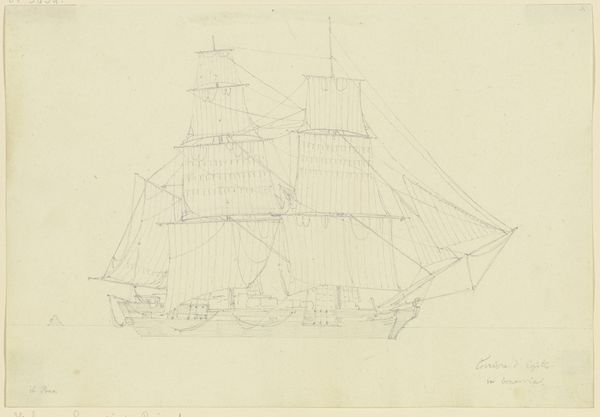 Curator: This is “Zeilschip,” a pencil drawing by Gerrit Willem Dijsselhof, created sometime between 1876 and 1924. Editor: Immediately, I am struck by the energy—the nervous lines giving the impression of constant movement. It’s restless, capturing the power and precarity of seafaring. Curator: Indeed. The quick, sketch-like quality draws attention to the artist’s process. Note the interplay of line and void—how the sails are suggested rather than fully described. Editor: For me, the sketch style enhances its symbolic impact. Ships often represent journeys, the unknown, or a longing for home. Dijsselhof seems to have captured that romantic ideal but within the very real context of labor and struggle, all these feelings caught up with life at sea. Curator: Absolutely. The artist’s use of a limited tonal range – predominantly grayscale – reinforces the linear structure. Look how the masts, at different depths in space, create distinct layers with carefully constructed diagonals. The eye follows these orthogonal lines to the horizon. Editor: Considering Holland’s maritime history, I can’t help but interpret this vessel as an almost totemic image for the Netherlands itself. Ships enabled exploration, trade, and expansion—a collective national enterprise deeply embedded in the Dutch psyche. There's an underlying sense of historical weight here. Curator: It is worth observing how the horizon line appears hazy. It has none of the rigid precision typically found in maritime works from earlier Dutch masters, such as Jan van de Cappelle. Editor: Very true. It is though he has caught something ephemeral – that split second when sea, ship, and sky merge in that grey marine light that so typifies this country’s atmosphere. Thank you; that's certainly shifted how I see the image now. Curator: A stimulating dialogue—the experience of encountering it formally while noting its significance. Editor: Yes, by balancing a formalist outlook with an iconographic perspective, it's expanded my understanding and emotional connection to this image of a sailing ship.