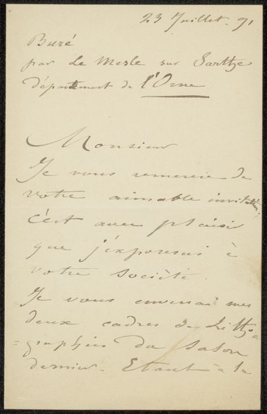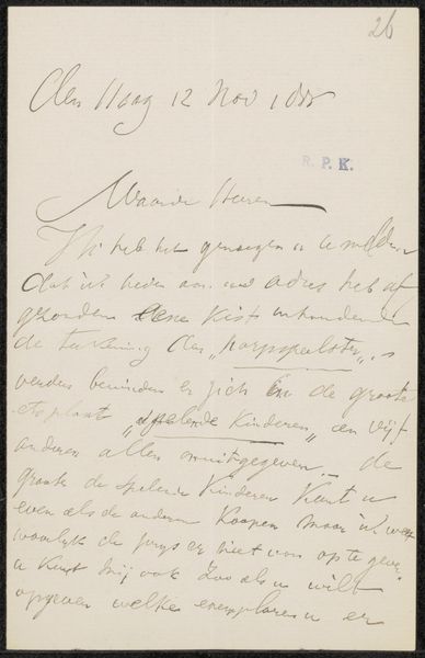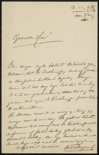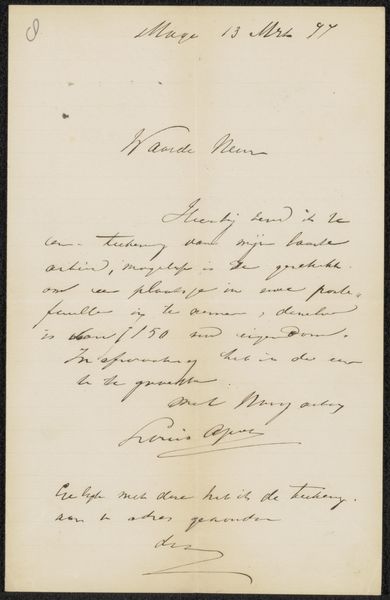 Curator: This work here at the Rijksmuseum, “Brief aan Frans Buffa en Zonen,” is attributed to Louis Apol and thought to have been made around 1887. It’s ink on paper, a beautiful example of the artist's hand in written form. Editor: My first impression is one of intimacy and perhaps slight desperation. The handwriting, while elegant, feels rushed, almost urgent. Curator: Yes, you see that inherent emotional weight carried by handwriting itself, which remains one of the most profoundly human visual signifiers. The act of writing, then as now, binds the writer's intention with a physical trace. We can almost imagine Apol's frame of mind as he formed each stroke. Editor: Exactly. Given that Frans Buffa en Zonen was a prominent art dealership, one has to wonder about the context of this letter. Was it a request for representation? Perhaps it was a note related to money or perhaps a pressing matter affecting his ability to create art? The contents point towards that direction, and if one carefully considers the circumstances affecting Apol during his life and career, a complex picture starts to emerge. Curator: The script itself becomes symbolic. Notice how the looping ascenders and descenders give a rhythm to the text. Consider too how certain words are emphasized through heavier ink strokes – visual cues that underscore their importance. What I think we might be observing are symbols of his feelings woven through each gesture of his writing. Editor: It’s so revealing how the physicality of the artist is still here. I wonder about accessibility, too. Whose stories do our museums choose to tell? And how do we make sure these collections can reveal themselves as intersectional resources that connect to contemporary lives and questions? Curator: It raises profound questions, certainly. The letter may initially seem like a simple missive, but under consideration, it provides such insight into the artist’s life and what might have been of concern at that time. Editor: For me, looking at it with the sensitivity of human contact makes art that more important in public collections, revealing the real conditions behind our inherited legacies.