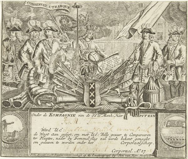 Curator: This is "Deel van een kaart van de Oostenrijkse Nederlanden," a print from sometime between 1737 and 1757 by Tobias Conrad Lotter. The baroque detailing around the central cartouche is what initially grabs me; how about you? Editor: It feels very busy, almost overwhelmingly so! I'm struck by the contrast between the decorative border and what seems like a fairly straightforward map section. It feels unbalanced. What do you see in the composition that I might be missing? Curator: I appreciate your attention to the balance, or lack thereof. Let’s consider the function of these contrasting elements. The baroque cartouche acts as a frame, but one that refuses to be purely decorative. Do you notice how it integrates scenes of labor? Construction and agriculture seem to define it as much as the ornamental flourishes. Editor: Now that you mention it, the contrast between ornamentation and practicality is really interesting! Almost like a commentary on the relationship between the rulers and the ruled? Curator: Perhaps. Or it could also point to the inherent tension between representation and reality within cartography itself. Are we mapping a territory or constructing an idea of it? Notice the stark linearity that define what appears to be "Flanders," a crude simplification perhaps, within the detail offered inside the baroque enclosure. Editor: That's a very different way to approach it! It shows the push and pull between something beautiful and something functional. I never would have seen that tension without you pointing it out. Curator: And I, perhaps, become too easily absorbed in decoding. Your initial sense of unease is equally valuable.