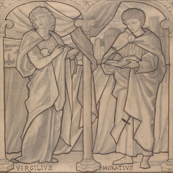 Curator: Right, let's talk about this striking piece, "Saint Matthias and Saint Jude with Articles from the Credo," believed to be created by Master d between 1450 and 1460. It’s rendered in coloured-pencil, surprisingly enough, in a print format. Editor: My initial reaction? Sombre. Even with the colour, there’s a weightiness to it. Like they're carrying the weight of the world, one with his axe, the other with what looks like a rather intimidating club. It’s quite… confrontational. Curator: The attributes are very symbolic, each saint identified by the tool of his martyrdom: Matthias and his axe, Jude with his club. What's really interesting to me is how the use of colour interacts with the linearity of the print. Look how the red and green define them, but never quite escape the bounds of the figures' outlines. Editor: The colour-pencilling almost softens the starkness of the figures though, doesn’t it? It adds a dimension that pure line drawing wouldn't capture. Look at the textures in the garments, those lovely, simple folds! The rendering feels simultaneously reverent and, well, medieval in its almost awkward depiction. And what’s with that perspective on the floor? Curator: That deliberate flattening is typical of medieval art—a rejection of strict perspective for symbolic clarity. It draws focus onto the saints, these pillars of faith. Those inscriptions, details from the Credo, floating above the saints reinforces that feeling. Editor: It gives them a beautiful weightiness; everything pushes inward. I appreciate how that heaviness highlights the fragility of faith through art, I love the texture, the overall colour palette and this slightly haunting look that seems frozen between past and present. It feels deeply human. Curator: Absolutely. And that, I think, is where the enduring power of this print lies—it invites us to meditate not only on faith, but on what it means to live, and sometimes die, for something you believe in. Editor: Well said. It's stuck with me already! Thanks for pointing out a few new angles, especially with your knowledge of technique and context.