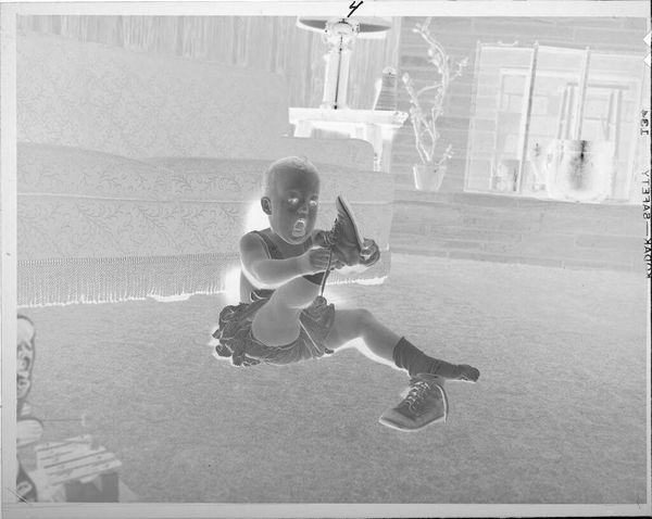 Curator: This is an untitled piece by Martin Schweig, a black and white photograph currently residing in the Harvard Art Museums. The dimensions are roughly 10 by 13 centimeters. Editor: My first impression is one of slightly unsettling domesticity. The inverted tones create an eerie stillness. Curator: Indeed. The composition is quite deliberate. Notice how the diagonal lines of the girl's pose and the table's design create a dynamic tension. Editor: I'm more interested in the context. The image hints at post-war family life, yet the negative exposure evokes a sense of unease. Curator: Precisely, and the choice to leave it untitled emphasizes the universal experience of childhood, devoid of specific narratives. Editor: Perhaps, but I see a commentary on the idealized image of family, disrupted by the stark reality of its portrayal. Curator: An interesting point. The formal elements certainly contribute to a reading beyond simple representation. Editor: Yes, ultimately this subversion of expectations encourages critical reflection.