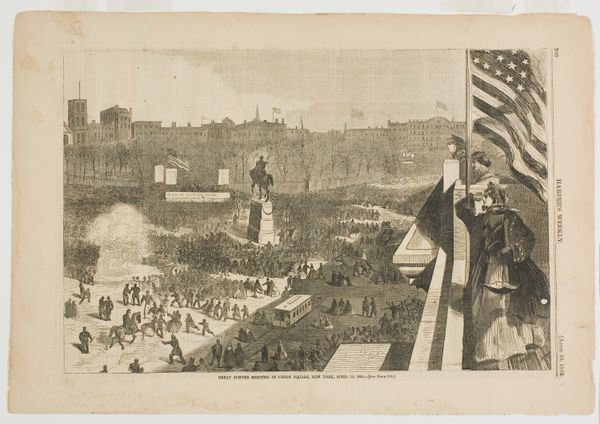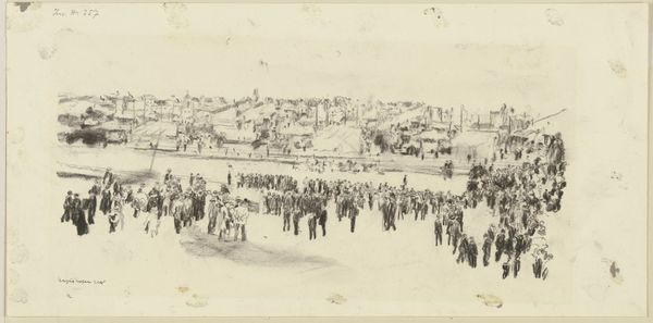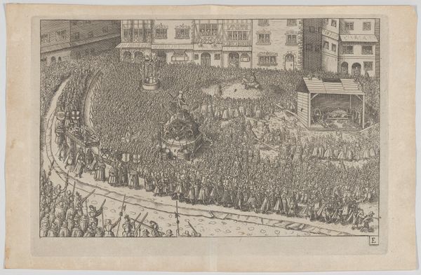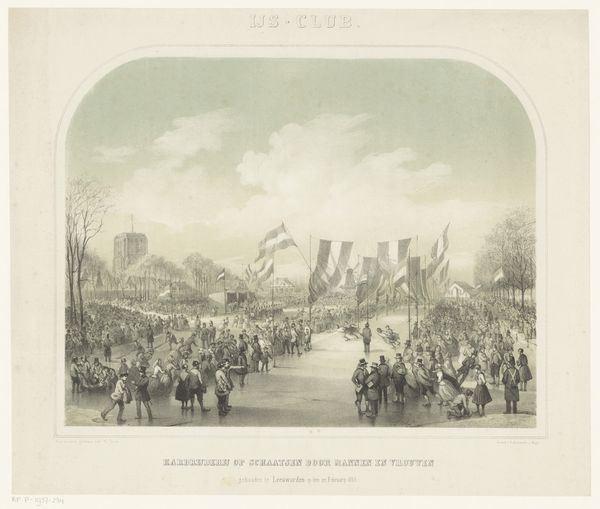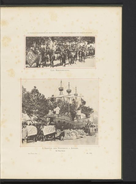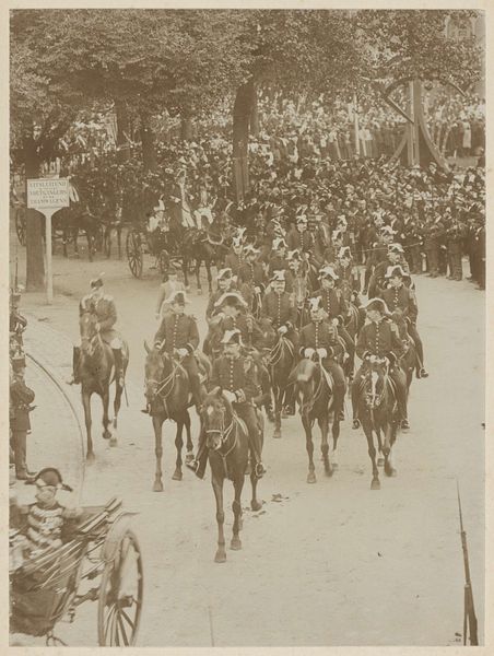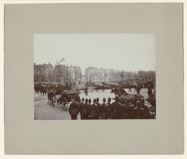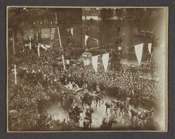 Editor: This gelatin-silver print, taken in 1891 by Henri de Louw, depicts Queen Wilhelmina and Queen Emma arriving for the cornerstone laying of the Wilhelmina Hospital in Amsterdam. It feels very staged but it tries to represent an important social event. What can you tell me about it? Curator: Let's consider this photograph in terms of production. What kind of labour and expense was involved in staging this photograph of a public event, and producing gelatin-silver prints at this time? These processes were emerging, and involved skilled workers and industrialists and consumers. What relationship can we deduce between technology, power, and public events at the close of the nineteenth century? Editor: I suppose the making of this photograph was much more of a technological investment. Unlike, say, painting. There's also the material components – the silver, the gelatin, and all the industrial processes needed to bring those elements together. It wasn't an easy process at all. Curator: Exactly. Consider also how the image itself, a material object circulated and consumed by the public, reinforces the power structures evident in the scene. It portrays a specific event in a carefully framed manner, subtly influencing public perception. Do you think the medium – photography itself – might lend a sense of truth to the representation? Editor: That's a good point. Because it's a photograph, we assume it's a more "realistic" view, even if it's staged. So, in a way, the material quality of the gelatin-silver print contributes to its message. I'm starting to see that materials can say a lot more than you expect. Curator: Indeed. And it highlights how choices regarding the means of production shape meaning. The art itself is evidence of its making.