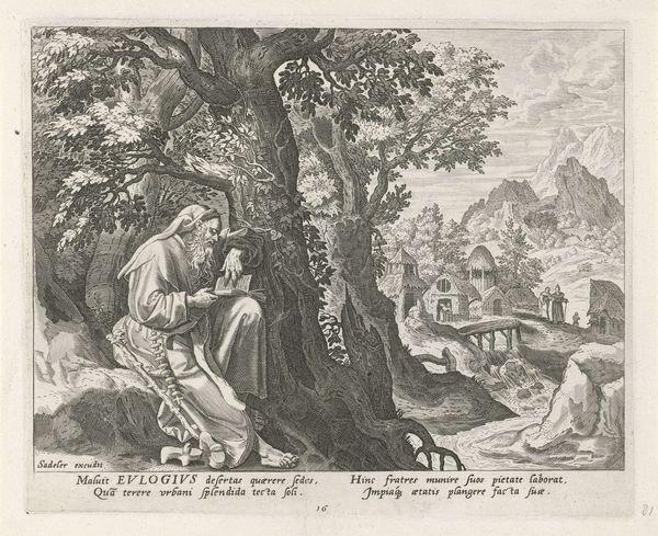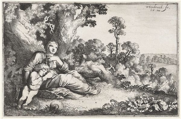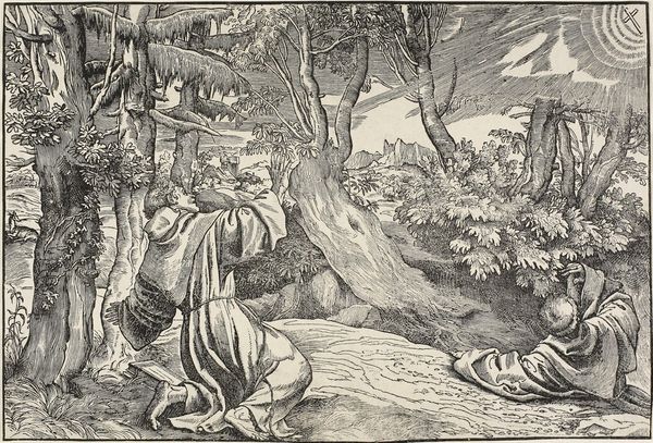 Editor: This engraving, titled "Christ and the Samaritan Woman" by Claes Jansz. Visscher, likely made between 1596 and 1630, really captures the imagination. There's almost a theatrical quality to it with the trees framing the scene. How do you interpret this work? Curator: Well, as a historian, I see it as a fascinating reflection of religious narratives in early modern Europe and the role engravings played in disseminating these ideas. Consider how printmaking allowed for the widespread circulation of biblical stories. Editor: So it’s like visual propaganda, spreading the story to more people? Curator: It's more nuanced than pure propaganda, though religious reformations certainly influenced imagery. Think about the socio-political context: engravings like these entered homes and shaped public understanding. How does the artist utilize the landscape itself to convey meaning, for example? Editor: I see that the trees create this sense of seclusion, setting a stage, separating Christ and the woman from society, drawing focus to the message rather than worldly distractions. Curator: Precisely! Visscher, whether consciously or not, taps into the broader artistic conventions of the period but also subtly shapes how viewers understand the power dynamics at play, the religious significance of the encounter. Do you find any evidence of class being a factor here? Editor: I think so, looking at the clothes, there is clearly one is in more elaborate robes compared to the modest dress of the Samaritan woman. Also her need to collect water versus Jesus being at leisure. Curator: Exactly, engravings weren't just aesthetic objects; they were embedded in a complex web of social, religious, and political power, teaching those who could afford such art in their homes. Editor: That's amazing. I will never see an engraving in the same way now! Curator: Me neither! Every analysis deepens our understanding.