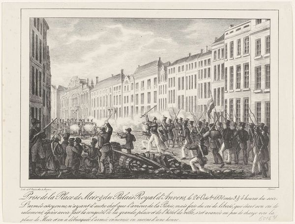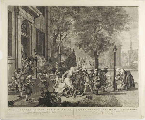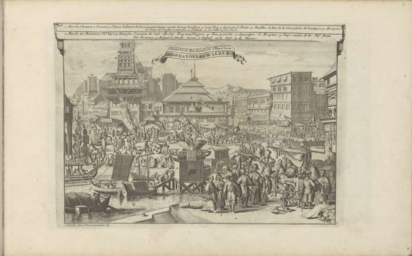 Editor: This is "The Industrious 'Prentice Lord-Mayor of London" by William Hogarth, created in 1747 using etching techniques. The sheer busyness of the scene strikes me; there's so much happening in this cityscape. How do you interpret this work, especially considering the social context it comes from? Curator: Hogarth was very interested in the public role of art. This print is part of a series, and it illustrates a narrative about morality and social mobility. The story idealizes industry, as you might glean from its title, linking diligence with prosperity and civic responsibility, at a time when London was experiencing rapid commercial growth. It's also an important visual record. Editor: A visual record, could you tell me more? Curator: Notice the details, for example: The buildings, the costumes, the gestures. These give us insight into 18th-century London’s urban life and social hierarchies. Also, consider the use of prints. Hogarth made art more accessible, circulating moral narratives to a wider audience beyond the elite patrons of paintings. Doesn't it strike you as rather different from traditional history paintings? Editor: It does. I'm used to history paintings being grand and focusing on famous battles or mythological scenes. This feels much more grounded, relatable even. So, it’s a commentary on the social fabric as well as an attempt to shape public values. Curator: Exactly! And this raises questions about the artist's own values and the target audience. Did he really believe in this straightforward meritocracy, or was he more nuanced? Also, think about the power of imagery during this period and how Hogarth effectively leveraged it to convey political messages. Editor: This gives me a lot to think about. Seeing it as part of a larger socio-political conversation helps me understand its lasting relevance. Curator: Indeed, Hogarth prompts us to consider the political and didactic potentials inherent within art.