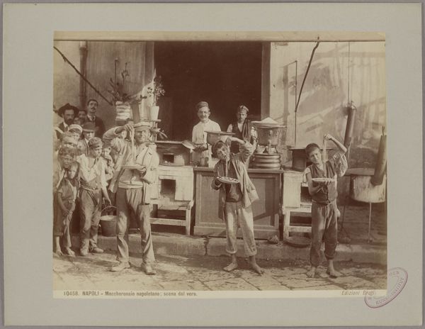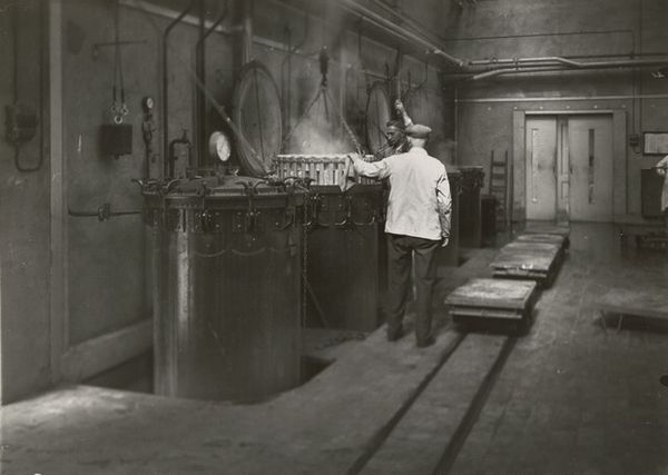 Editor: This is Lewis Hine's gelatin-silver print, "Glass Works, Midnight, Indiana, 1908." The scene is gritty, almost overwhelmingly industrial. What strikes me most is the palpable weight of labor depicted. How do you see this photograph? Curator: I see a critical document of industrial labor practices. Hine’s choice of gelatin-silver printing allowed for crisp details that showcase the materiality of the factory environment – the soot, the worn tools, even the clothing. But it’s not just about depicting reality, is it? Consider how the photographic process itself, dependent on the exploitation of silver mines and chemical manufacturing, mirrors the larger cycles of production and consumption that are on display. Editor: That's a very interesting perspective I had not considered before. So, are you suggesting that the photo is, in some way, a critique of the very system that enables its creation? Curator: Precisely! Look at the composition. The cramped space, the intense heat implied by the machinery… These boys are part of an industrialized system that processes not only raw materials but also young lives. Do you think that Hine's deliberate use of light helps emphasize that dichotomy? Editor: Definitely. The light almost seems to single them out, highlighting their youth amidst the dark, imposing machinery. It's hard not to see it as a commentary on exploitation. Curator: Absolutely. By meticulously documenting the process and the conditions, Hine reveals the social context of art making – or, in this case, the making of… everything else. What did you notice? Editor: I initially focused on the emotional impact, but now I realize the materials and means of production are central to the photograph's meaning. Curator: Exactly. Hopefully, this highlights the connection between materials, processes, and their place in historical movements of art and production!