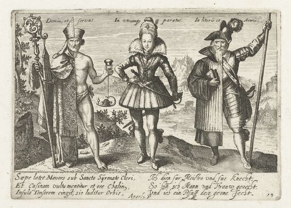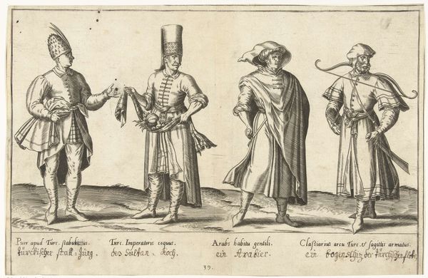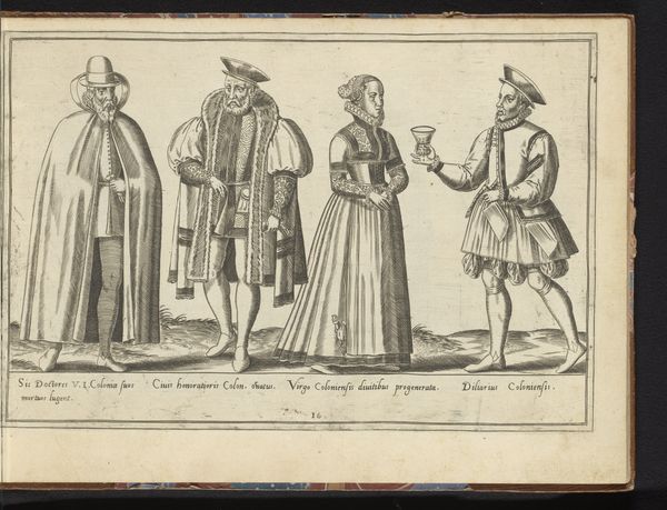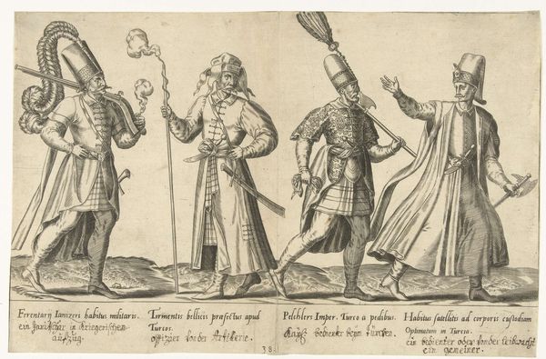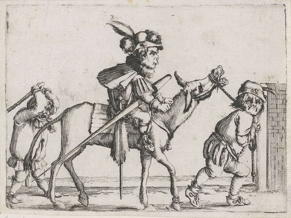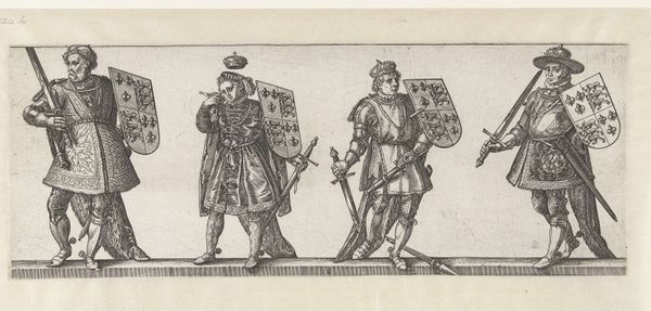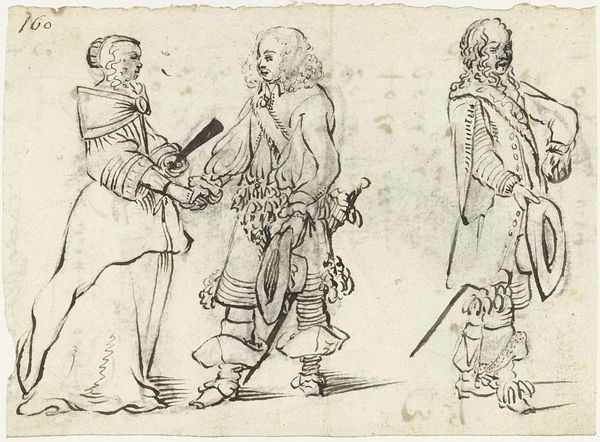 Editor: Here we have "Lansquenets and Ladies," a pen drawing from 1531 by Christoph Bockstorffer, currently residing at the Metropolitan Museum of Art. It reminds me of a frieze with these figures all lined up in a row. It’s pretty small, so it feels intimate. What do you see in this piece, someone clearly depicting daily life in Renaissance Europe? Curator: I see a fascinating glimpse into the cultural memory surrounding the Landsknecht, these mercenary soldiers. Consider their flamboyant attire, the puffed and slashed sleeves, and compare them to the ladies of court, who strike a similar balance of elegance, formality, and decadence. Editor: They're definitely making a statement! Was this kind of fashion typical? Curator: Exactly! They became icons of their time. But consider also, the drawing is more than a simple snapshot. Observe the symbols interspersed between the figures - a subtle reference of the artist? Can you recognize a certain "sprezzatura," that cultivated nonchalance they embody? It carries a potent message. Editor: I guess so, everyone in this picture has some serious swagger going on! It feels like a very male, very controlled world in some ways. The one man who sits down seems to possess some form of higher ranking position as well. Curator: An insightful observation! Rank definitely shapes the language here. How might these sartorial choices communicate power and belonging within their world? The symbolism of belonging here evokes a potent collective identity. A way to build trust for people who can be easily bought or persuaded. Editor: That’s so interesting; so it is not just fashion. Curator: Not at all! These figures, rendered in such deliberate detail, allow us to contemplate their emotional and psychological world but how the clothing, culture and tradition influences these. Perhaps their anxieties. I like this idea about being intimate. After all, how might the fleeting moments and social interactions define larger cultural narratives and individual selfhood? Editor: Wow, that makes you see this snapshot in a whole different way. So much for such a tiny drawing.