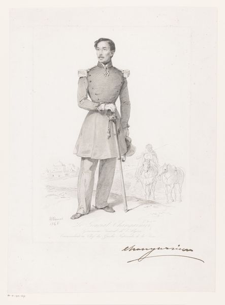 Curator: This is François Forster's "Duke of Wellington," residing here at the Harvard Art Museums. What are your initial impressions? Editor: He looks…imposing, yet strangely vulnerable. Like a marble statue trying to blend into a forest scene. Curator: Notice how his gaze meets ours, while the natural elements create a romantic, almost theatrical, backdrop. It speaks to the power and the burden of leadership. Editor: That sword he clutches… it's as if he's both embracing it and wishing it would disappear. War is so enmeshed with personal identity here. Curator: Yes, and the composition reminds us that even the most powerful figures are shaped by the landscapes and historical forces around them. Editor: A potent reminder of how our heroes can be just as captive to their times as we are. Curator: Precisely. Forster captures that tension beautifully.