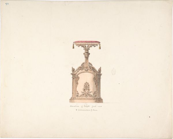 Editor: So this is "Elevation of a Pulpit, Side View, R. Edmundson & Sons," a watercolor, etching and drawing from sometime between 1815 and 1840. It's surprisingly delicate, given that it's an architectural plan. What do you make of it? Curator: This image foregrounds the labour involved in architectural design, right? We often separate ‘art’ from practical craft, but here the meticulous rendering, the very hand that drafts this pulpit, becomes central. Consider the materiality of its making: the paper, the pigments painstakingly applied... It underscores the social context; religious spaces commanded significant resources. How does the scale of the adornment speak to this? Editor: Well, it seems pretty ornate, but maybe restrained for the period? There is the lush red cushion on top, but the rest is mostly line drawing. Curator: Exactly! That interplay of opulence, suggested by the detailing, with the comparative austerity of the rendering – the etched lines, the wash of color – hints at a negotiation. Labor creates objects. Religious institutions also create specific subjectivities, and what about that tension, of display, yet perhaps also modesty in faith? Who are Edmundson & Sons trying to reach with this design, and with what materials are they selling this "elevation"? Editor: That makes me wonder about the intended audience – clergy? Patrons? Also, how the choice of watercolor and etching might have impacted perceptions of the design compared to say, an oil painting of it. Curator: Precisely! The medium *is* the message, or at least an important part of it. It makes me think of the economic forces driving these aesthetic choices, and the labor that is needed. How are sacred spaces themselves commodified through design and presentation? Editor: It's fascinating to think about something seemingly functional like a pulpit elevation as this site where artistic labor, religious ideology, and social status all intersect. I’ll never look at architectural drawings the same way! Curator: Indeed! Seeing the process of making allows us to understand production of the sacred space within specific socio-economic relationships, rather than as the solely divine.