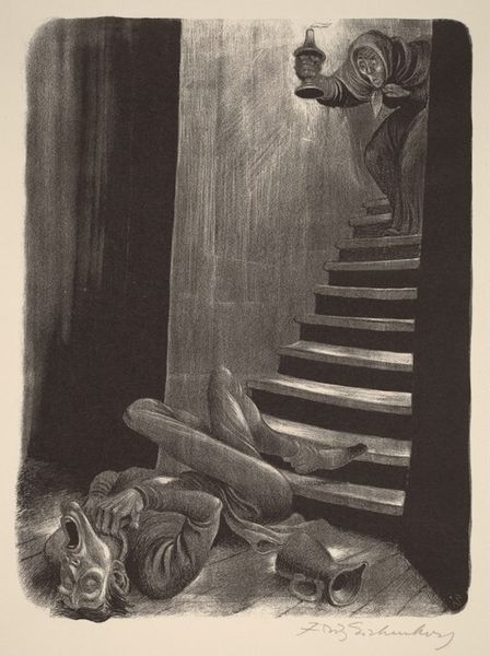 Curator: Standing before us is "Lumiere," a lithograph created in 1893 by Odilon Redon. What’s your first impression? Editor: Gloom. Enormous pensive face looms over, what appear to be, two figures who might be praying. There’s something quite somber, monumental, even…oppressive about it. The textural contrast, the vast face hovering behind this rather dark interior – what exactly is going on here? Curator: I sense that gloom as well. It almost feels like staring into a dream—or perhaps more accurately, the shadowy edges of a nightmare, right? It embodies Redon's symbolic exploration of inner worlds, grappling with both darkness and the potential for enlightenment, or, *lumiere.* Editor: Interesting. Lithography, though— a really crucial process here, wouldn’t you agree? It's amazing what Redon accomplishes with a relatively 'accessible' medium. Think about the labor, the grind of the lithographic stone, and the scale he achieved, seemingly playing with mass production while exploring unique, deeply personal imagery. Curator: Precisely! Lithography allowed for such subtle gradations, permitting Redon to achieve these ethereal qualities. Consider those tiny figures below - perhaps they're meant to suggest our own smallness in the face of grand ideas or even cosmic forces, that 'lumiere' being both a literal light source and a symbolic beacon. Editor: The use of a window-like frame containing the looming face reminds me that even grand gestures can feel isolated and that these so-called artistic 'insights' always carry with them the traces of collective labor and the historical conditions that made them possible. The way Redon uses line and shading really emphasizes a tangible, material history. Curator: I do love that it refuses any singular interpretation, much like dreams themselves. Is it a deity looking down on mortals? Is it a mind wrestling with itself? Perhaps Redon leaves it open to ignite our own, personal *lumiere.* Editor: Ultimately, seeing Redon so consciously exploit the capabilities of lithography really reframes how we think about printmaking – it moves us beyond mere reproduction and into the realms of artistic vision intertwined with, and fundamentally reliant on, industrial techniques. Curator: Agreed, I think viewing the work from our distinct vantage points just enriches the whole viewing experience. Thanks! Editor: Absolutely! It has been enlightening.