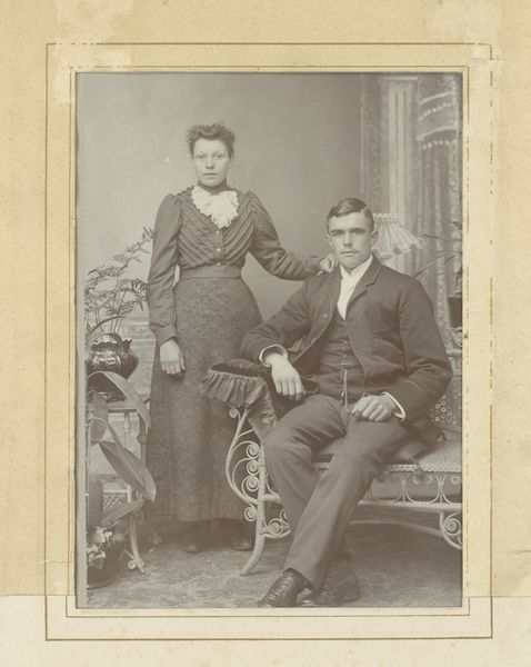 Curator: Here we see a striking turn-of-the-century portrait, believed to have been taken between 1880 and 1920, known simply as "Portret van een echtpaar", depicting a formally dressed couple. It's an interesting example of pictorialist photography. Editor: My initial feeling is that the pair strike quite a melancholic pose. Despite the formality of dress, and their assumed status, there’s a distinct air of somberness about their faces. Do you get that? Curator: Indeed. Early photography, especially for formal portraits, had an inherent gravity. Consider though that their pose, while seemingly simple, echoes countless paintings and images that communicate not only the visual representation of a couple, but speak to historical notions about fidelity, obligation and sanctioned relationships between people. Editor: Yes, exactly. The woman’s hand, resting perhaps a touch possessively on the man’s shoulder, underscores the sanctioned and constructed nature of this coupling. One could read the formality of their dress codes, with high lace collars on the woman, to reveal rigid expectations about class and gender at the time. Curator: What I find fascinating about photographs such as these, especially from the pictorialist movement, is how they borrowed so deliberately from the aesthetics of painting. Note the soft focus, and the way light and shadow render these two figures. Their cultural identity, as well, comes down to us through not only the symbolic trappings of clothes and background setting, but pose. It gives visual language an immense continuity over time. Editor: Absolutely, and the emotional impact isn’t incidental either. There is also an economic subtext. They would have consciously curated the public presentation of themselves; after all, these weren't snapshots, but commissioned photographic items intended for circulation among family, and in social spheres. The setting acts almost like a stage. Curator: Looking at this, I am struck again by how powerfully early photography, though intended as a simple "record" of a moment, functions to actively encode its sitters into pre-existing narratives. This is how, in essence, history is created, framed, and reframed for successive generations. Editor: For me, the real takeaway here is recognizing how images never appear innocently, but participate, then and now, in systems of communication about how society arranges itself. Food for thought.