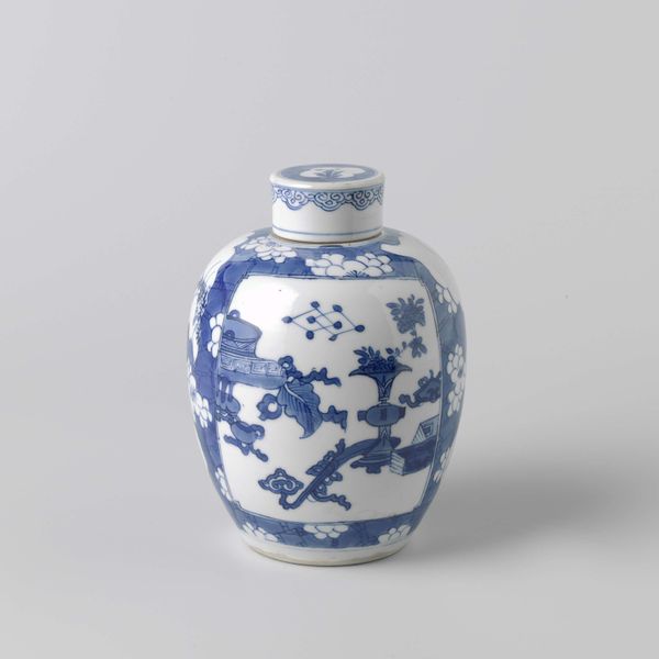 Curator: This lovely ceramic piece is titled "Ovoid covered jar with three figures and a deer in a landscape," created by an anonymous artist sometime between 1680 and 1720. You can see it here at the Rijksmuseum. Editor: It's smaller than I imagined! Somehow the dynamism of the figures against the serene landscape creates this sense of bustling miniature worlds all its own. It almost feels like peeking into somebody else's cherished memory. Curator: Precisely. The depiction showcases Asian artistic techniques which favored miniature narratives, highlighting figures, landscapes, and mythical creatures in one view. Editor: I find myself drawn to how those vibrant blue figures, really seem to dance on the white backdrop. It really draws my focus in ways a static landscape simply couldn't, especially within the context of Dutch fascination with imported Delftware at this time. Curator: Yes, it's important to remember the socio-political context, The figures and the deer are also strategic symbols, carefully arranged within this context to meet a globalizing art market. It’s a kind of delicate cultural dance to engage consumers. Editor: You know, even with the deliberate attempt to target certain audiences, the overall feeling I get is quite dreamlike. Like watching these fleeting characters momentarily frozen in a jar – it’s got that magic spark! It also challenges you, what stories are contained within its boundaries, the quiet little ceramic dramas frozen inside? Curator: That's the allure, isn’t it? These sorts of objects invite us to reconsider how art serves society in an evolving world. Editor: Well, it makes me question our stories, our role as observers, in the end.