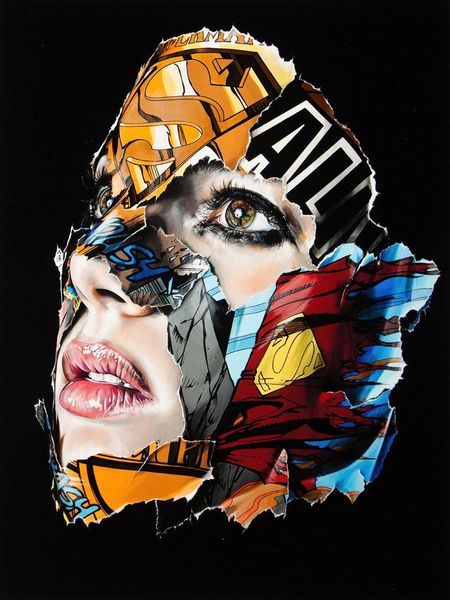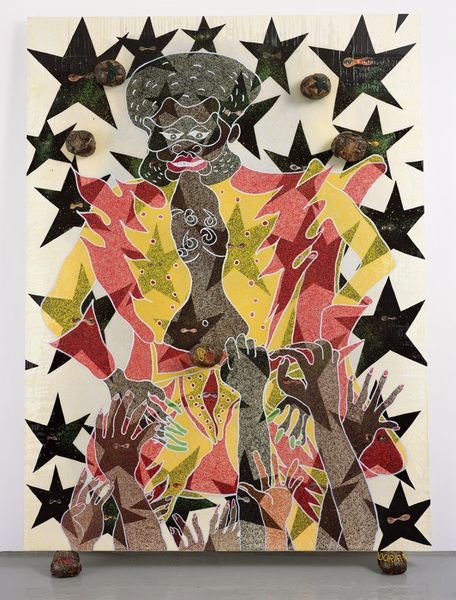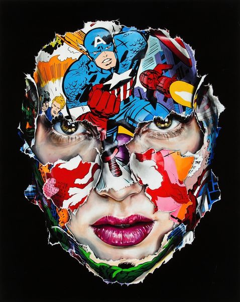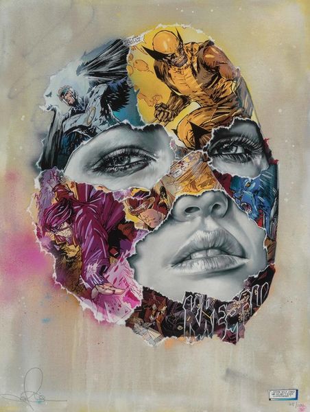 Curator: Sandra Chevrier’s 2022 piece, "La Cage chromatique," blends acrylic and mixed media into a compelling matter-painting on canvas. The composition immediately struck me; those piercing eyes set against that vibrant, almost violently colorful facade... what's your take? Editor: It feels…suffocating. All those layers, that build-up of paint—it’s like a mask, or maybe a cage, as the title suggests, built of pure color. A beautiful cage, admittedly, but a cage nonetheless. How does it sit within Chevrier’s broader commentary on contemporary portraiture and societal expectations, in your view? Curator: Precisely! Chevrier, in pieces like this one, frequently juxtaposes the hyper-realistic painted faces of women with comic book fragments, or other elements. "La Cage chromatique" diverges from that practice, moving into matter painting; building a literal *mask* over a woman's face by collaging together thousands of globs of color. These vivid marks act as an obstacle to our gaze, making visible that push and pull between hiding and revealing. I read her work as commentary on the limitations imposed upon women; but also how women construct elaborate disguises in order to subvert restrictive beauty standards. What is that saying...? "I must create a system, or be enslaved by another man's." Editor: Right. And that notion of the mask resonates deeply with art history. From ancient rituals to contemporary performance, the mask represents transformation, concealment, power... and in this case, perhaps a form of resistance. But how does the "pop art" element play in this scenario, considering the contemporary themes of female identity that Chevrier explores? Curator: I believe she invokes a pop sensibility only to subvert its core appeal. In terms of production and access, pop art aspires for the rapid production and democratized reach of art. And yet, "La Cage Chromatique" doesn't make this claim. By building layer upon layer of unique marks, Sandra is in fact building an exclusive artifact, resistant to rapid consumption and commercialization. Editor: So, not a celebration, but more like a critical adaptation. That's an interesting reading, particularly in today’s climate, saturated as we are with digitally manufactured images. Curator: It really forces us to confront what we value—authenticity, perhaps, versus manufactured perfection? Something to meditate on. Editor: Definitely gives you pause. The kind of work that stays with you, and probably changes with you each time you see it.