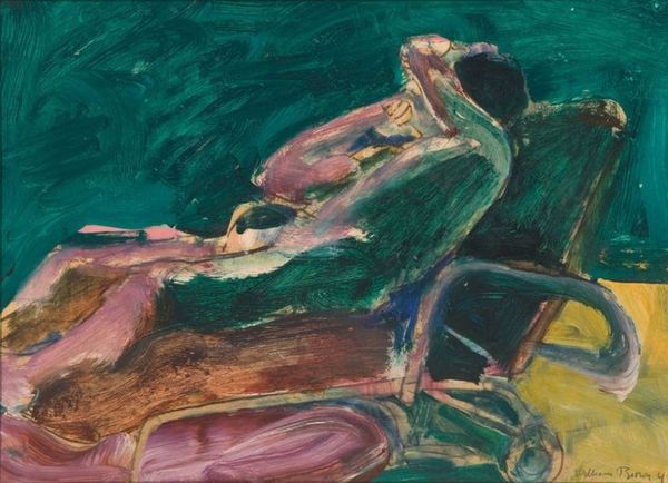 Curator: I’m struck by the sheer immediacy of this image. Editor: Indeed. We're looking at Edvard Munch's "Women in the Bath," created in 1917 using oil on canvas. What draws you in first? Curator: It's the convergence of raw vulnerability and domestic ritual. These women bathing transcend the everyday; they represent, perhaps, a communal subconscious or a shared understanding of self and femininity through exposure. There’s a Fauvist wildness about it too, in the coloration. Editor: You know, it's the application of paint itself that grabs my attention. See how Munch manipulates the oil to achieve this layered effect. There’s visible brushwork and transparency creating this palpable tension on the surface. It reflects perhaps something about how labor and process, the gestures involved, contribute meaning here – as though the material fights against resolution or traditional form. Curator: Interesting. Given the context, post-World War I, one might even interpret the scene as a visual manifestation of social anxiety and shared female experience. Munch often explored themes of anguish. Are the red undertones a psychological indicator? Editor: The red certainly provides an emotional grounding for it all. Speaking materially, the relative availability of different pigments must have guided some of these choices. And it all emphasizes the corporeal: look how the blue hues at the lower portion mimic, and thus materialize, the sense of actual submersion. Curator: Yes! Color choices, intentional or accidental, evoke very primal connections between water, body, and emotions. But the arrangement—these obscured or semi-obscured figures bathing—can be also interpreted as a metaphor for society, for hidden realities, for shared experiences both beautiful and burdened by cultural anxieties. Editor: Exactly, so to recap, it's a wonderful glimpse into art-making as both concept and physical undertaking... Curator: ...Revealing cultural history through emotion.
