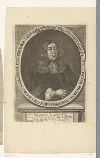 Curator: Here we have a striking engraving from 1686, a portrait of Johann Wilhelm Baier, created by Johann Georg Göbel when Baier was 39 years old. The piece resides here at the Rijksmuseum and exemplifies Baroque portraiture in print form. Editor: Oh, wow, this image just pops with a very thoughtful, almost introspective vibe. I feel a seriousness, like I am in the presence of deep contemplation. And such fine detail for an engraving; it seems a testament to dedicated work. Curator: Indeed. Printmaking played a vital role in disseminating images of prominent figures, solidifying their reputations and spreading their influence in the early modern period. This portrait served to showcase Baier's intellectual and social standing, which certainly mattered in that period. Editor: It’s interesting how the engraver, Göbel, uses this oval frame device. It contains, literally, but also amplifies. Like a focused beam highlighting the main subject while reminding us he’s contained within certain societal boundaries of expectation. I guess everybody always lives like that, contained, to some extent, though we try to stretch at those edges. Curator: Precisely! The inscription surrounding the oval identifies Baier by his titles and origin, emphasizing his learned stature as a theologian and professor from Nuremberg. The act of inscribing within the frame becomes almost a formal announcement of worth, so that everyone knows. Editor: I am struck by Baier's face, as captured in ink. See, there's something incredibly human—I am curious about his thoughts. What did he consider worth knowing? The book he’s holding…did it ignite fires within, or merely uphold old dogmas? Oh, this one engraving sparks so many questions about history's individuals! Curator: That's a lovely perspective. For me, studying the public image becomes intriguing. How were figures like Baier intentionally framed to project certain values, confirming ideas about the connections between knowledge, authority, and social power during this age. It is more than likeness. Editor: Right! Okay, the intersection between the personal and the projection is forever relevant. And as always with art, one wonders— what truths can we discover and take forward into our modern era. Curator: I agree. By appreciating the artwork here on display, "Portret van Johann Wilhelm Baier op 39-jarige leeftijd," we touch on historical image-making itself. Thank you for sharing today, our conversation has added another valuable layer.