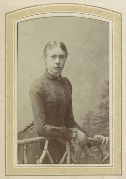This is Johan Herman van der Laag's photographic portrait of a woman in a dress by a fence, made sometime between the late 19th and early 20th century. As photography became more accessible, portraiture shifted from being exclusively for the wealthy to capturing a broader spectrum of society. This photograph invites us to consider the nuances of class and gender during a time of significant social change. The woman's poised demeanor and fashionable attire, complete with decorative brooch and bracelet, suggest a certain social standing. Yet, there's an intriguing tension created by the rustic fence she leans against, hinting at a connection to nature or perhaps a commentary on the constructed boundaries of society. This image exists not only as a representation of an individual but also as a mirror reflecting the complex interplay of identity, status, and environment. It reminds us that every portrait is a dialogue between the subject, the artist, and the world they inhabit.