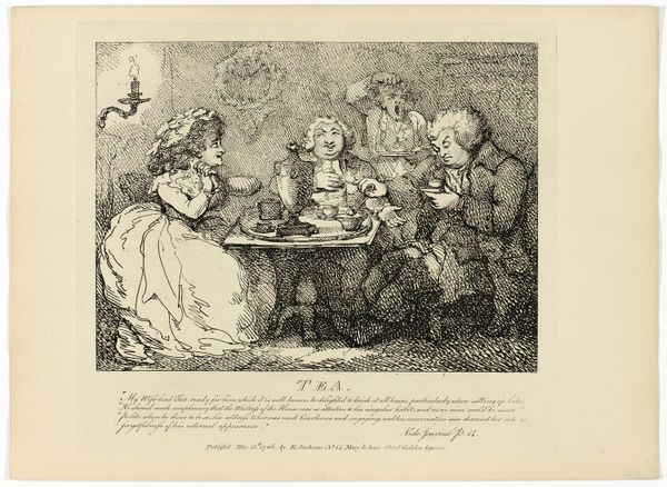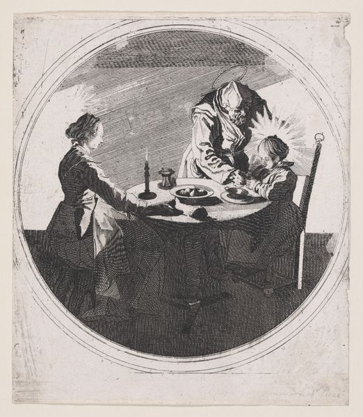 Editor: So, this is Honoré Daumier’s lithograph from 1842, a print titled “Look! See how his eyes are on the saveloys and the ham… it seems we like Papa's job?… my little piglet!”. The cross-hatching is incredible; it creates such a gloomy, domestic atmosphere. It feels really pointed. What jumps out at you when you look at this work? Curator: Gloomy, yes, but isn't there also a spark of mischievousness there? Daumier was a master of capturing the subtle dramas of everyday life. Those hams hanging overhead practically scream bourgeois comfort, while the father's eyes... they're gleaming with a certain, shall we say, earthy delight. Notice how the light emphasizes the father compared to the comparatively paler subjects of the child and mother; he seems almost devilish, illuminated, contrasting with his more ethereal family members. What do you think Daumier is trying to convey about family life? Editor: That domesticity could be both a blessing and maybe… a little bit of a trap? The title, it feels almost sarcastic. I almost pity this child with food set to be the basis of love? Curator: Precisely! The print is a window into the complexities of marriage and social satire under the July Monarchy in France, but the sentiment seems almost eternal. He's questioning the roles we play and the values we pass down, one saveloy at a time. And let's not forget the comedic flair—that subtitle "my little piglet" walks the fine line between tenderness and well-meaning, but possibly overbearing pressure, doesn't it? It seems there is so much we pass to our children, be it love or expectation. Editor: Definitely gives me something to chew on. There's so much conveyed in the smallest of lines. Curator: Indeed, and that's Daumier’s genius. He makes us laugh, but then leaves us with a lingering aftertaste of self-reflection.