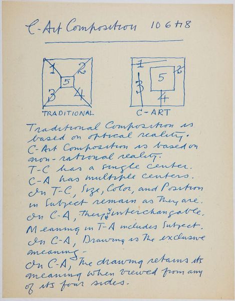 Curator: Stuart Davis created this work, "Art Theory Text with Standard Configuration Diagrams." It's undated, but gives us a glimpse into his artistic process. Editor: It feels like a page ripped straight from a sketchbook, raw and unfiltered. The diagrams are so simple, almost childlike, yet the handwritten text hints at complex ideas. Curator: Davis was deeply interested in the underlying structures of art. These diagrams seem to explore basic geometric relationships, almost like a visual language to decode his own paintings. They are powerful symbols, really. Editor: I'm also thinking about the cultural context. Davis was working in a time of huge social upheaval; maybe these diagrams were his way of seeking order in a chaotic world, finding ways to use art as resistance. Curator: It's fascinating how such a simple sketch can contain so much—a whole theory of art distilled into a few lines and shapes. Editor: It really does make you think about how artists use visual shorthand to convey incredibly layered ideas.
