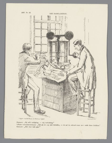 Curator: Welcome. We are standing before a work titled "Bewijs van toegang ter bezigtiging van het tweede gedeelte der Galerij Schilderijen, enz. van wijlen Z.M. Willem II, Koning der Nederlanden. Van 18 Augustus tot 6 September 1851", created in 1851 by an anonymous artist. It’s a pen and ink drawing with printed elements now residing here at the Rijksmuseum. Editor: Oh my! The mood… well, I find it peculiar! Is it meant to be humorous? I sense a hint of caricature with sharp irony that almost pricks, you know? It is so intricate in detail, yet overall its design reads somewhat like a riddle. Curator: Absolutely, you're spot on about the caricature. It also fits within a genre painting context with a clear satirical viewpoint, if you consider the items of “wageninges” and “Amersfoortdos" depicted as part of the whole tableau. This was part of a social commentary from the Netherlands on King Willem II's art collection being accessible for public viewing. Editor: That little figure behind the smoking man...what IS that? The man in front is calmly handling his smoke, but there is all of this crazy imagery crowding him; even a small illustration of corn stalks hanging over his shoulder! Curator: Consider this from a political and social viewpoint in its time: It shows the availability and, frankly, chaos in cataloging his acquired possessions after the King's death. Its publication was no simple matter and part of ongoing public debates in 1851! Editor: It certainly isn’t a simple still-life of someone peacefully enjoying their tobacco. I see now the satire! The artist layers detail upon detail to really evoke an overall feeling of absurdity. What looks like casual enjoyment, with closer examination, morphs into biting wit. It seems both cutting and, perhaps, just a tiny bit self-deprecating! Curator: It mirrors much of the political instability following Willem II’s rule; using caricature, the artist gives life to a national situation and mood in Dutch society after his passing. Editor: Amazing! Well, my first impressions were admittedly muddled; understanding the satirical lens reveals such fascinating cultural critique in all those dense lines and implied shadows. Curator: It certainly is. It also reveals to us that a single image can offer access to whole historical perspectives and reveal a complex historical debate to a contemporary audience.