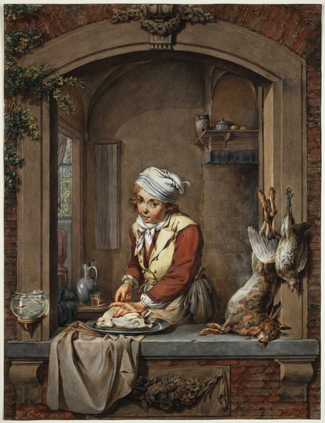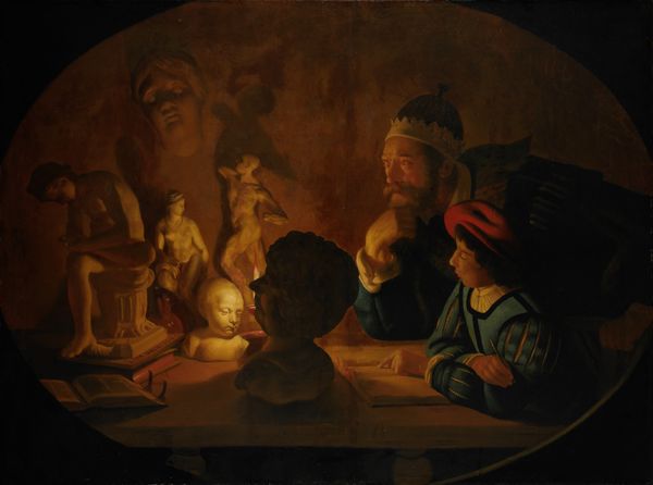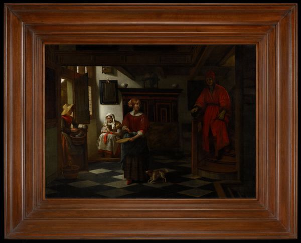 Curator: Immediately, I feel enveloped by the domesticity, yet a certain… thickness to the air. It's dark but warmly so, do you feel it? Editor: Absolutely. Let's orient our listeners. We are looking at "Sending the Boy for Beer," a painting from circa 1655-1657 by Frans van Mieris the Elder, housed here at the SMK. It's oil on wood, which might contribute to that intimate feeling. A glimpse into a Dutch Golden Age home, no? Curator: Golden maybe in hue but consider those figures. Van Mieris, he gives them to us plain, real. A rosy-cheeked woman enjoying a meal while the menfolk…well, one of them is on an errand, perhaps not so eagerly given his stance, yes? And consider the vegetables there. They remind us of daily living. It pulls me right in to a world of simple survival, with complex social structures. Editor: You’re right, this is genre painting elevated. It seems a clear-eyed depiction of 17th-century life. What resonates with me is Van Mieris’ commitment to realism. But I have a question, why send the boy? Are there suggestions of what sort of society it could have been where he’s being sent? Is there potential drama? Curator: Ah, the unasked questions! Maybe this little tableau mirrors how boys, not men are sent to handle those errands which hold little authority. This creates a familial tableau, right, rather than that social power imbalance? Do you see? Perhaps what is happening is much more commonplace that how much we see and how much our experience changes. I imagine myself as a child like him, maybe feeling resentful or misunderstood and then…nothing. Editor: Indeed. Frans Van Mieris invites our reflection. There’s so much socio-economic data, social commentary. What appears quaint, hides questions. Curator: So, the darkness is the drama then. And not even very big, which gives all the comfort to me! I walk away grateful I understand a little bit more, what about you? Editor: I walk away more grateful and cautious for social constructs. Thank you!