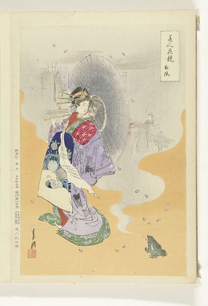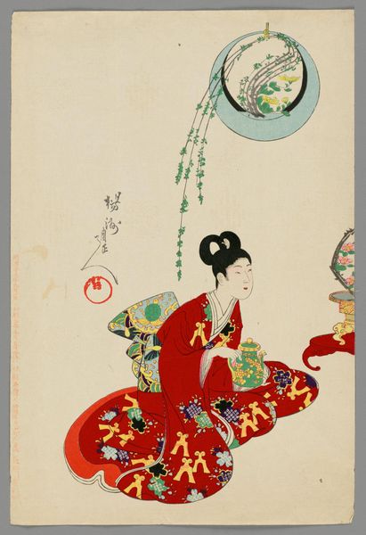 Curator: So here we have Tsukioka Yoshitoshi’s “Ibaraki,” a print from 1880 rendered with ink, offering us a glimpse into Japanese folklore. What strikes you first about it? Editor: The monster's striking. It’s powerful but also seems burdened by something, or trapped. What context would illuminate a deeper reading of this image? Curator: Well, Yoshitoshi often used the supernatural to comment on the political and social upheavals of his time. Consider the role of folklore in reflecting societal anxieties. How might a fearsome figure like Ibaraki function as a symbol in late 19th-century Japan, a period marked by rapid modernization and cultural clashes? Editor: I guess the fear of the unknown, the fading traditions perhaps? The demon’s ornate robe seems to clash with its monstrous form. Curator: Exactly! The demon is dressed in what appears to be courtier’s robes, but the disjunction and the gnarled form complicates any singular message. What social norms is the demon violating and what societal structures are producing such transgression? Perhaps Yoshitoshi is posing complex questions. Is this monster a cautionary tale, or does it represent a rebellion against societal constraints? What do you make of Ibaraki being female, in certain iterations of the fable? Editor: Thinking about that period of modernization, maybe the demon is about what happens when we shun part of ourselves or our past in pursuit of something new and ‘modern’? Curator: Precisely. Art, like folklore, becomes a site where those cultural anxieties and resistance are expressed and negotiated. I'd encourage to think about the construction of monstrosity to reinforce societal boundaries and power structures. Editor: So, looking at “Ibaraki”, it’s more than just a fantastical creature; it’s a reflection of a society grappling with its identity, its past, and its future. Thanks. I see a lot more now. Curator: Absolutely. Approaching art with a critical eye lets us consider perspectives and power structures and reveals new and rich ways of interpretation.