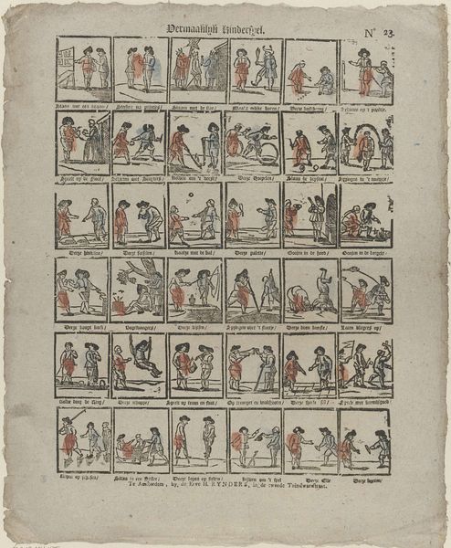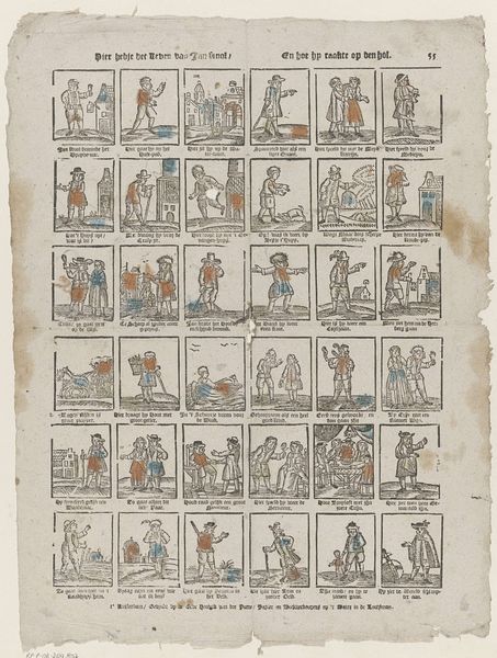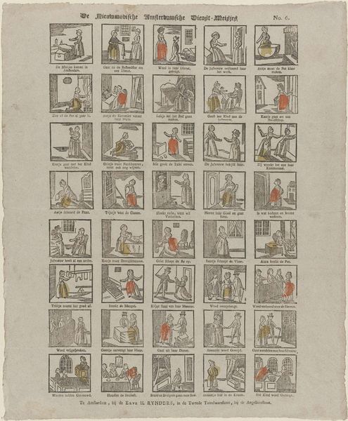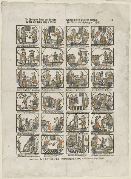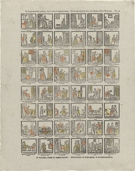 This undated print by Johannes Kannewet is titled "Hier heeft de jeugd tot haar gerijf / Jan den Wassers leven en bedrijf" and resides in the Rijksmuseum. Composed of 42 small, framed vignettes, the print presents a sequence of scenes from daily life, rendered with fine lines and minimal color. This structure creates a sense of order and categorization, inviting us to read the narrative as a set of discrete, yet interconnected episodes. Kannewet employs a formal approach that mirrors the structuralist interest in systems and relationships. The modular format, where each scene is contained within a frame, highlights the print's construction as a series of signs. Each image functions semiotically, contributing to the broader narrative. The limited color palette and precise linework further emphasize form and structure. Note the strategic use of spatial arrangements within each scene, guiding the eye and suggesting relationships between figures and objects. These compositions invite us to consider how the artist used visual elements to convey meaning. This piece can be seen as a cultural artifact that reflects the philosophical underpinnings of its time.