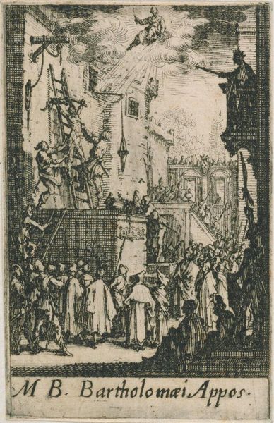 Curator: This is Jacques Callot’s "Martyrdom of Saint Simon," a small but intensely detailed etching. I’m immediately struck by its scale. It’s hard to believe so much detail is packed into such a tiny space. Editor: The engraving shows the brutal execution of Saint Simon, and it sits within this grand architectural stage. Its relationship to ideas of power, spectacle, and religious persecution are striking. The crowd's complicity is palpable. Curator: The intricate lines are incredible. Callot was a master printmaker, known for his technical skill. You can almost feel the texture of the paper and the pressure of the plate. Think about the labor involved in making such a work, the precision required. Editor: Yes, and it’s impossible to ignore the political dimensions. Saint Simon, and others like him, were killed for refusing to bow down to oppressive social structures, speaking to the intersectionality of religion and resistance. Curator: Absolutely. And perhaps Callot's process mirrors that resistance somehow, the act of making and distributing images a way of challenging authority. Editor: It’s unsettling to see how images of violence are reproduced and consumed, even within a religious context. It's a reminder of how visual culture shapes our understanding of violence. Curator: Precisely. It's about the materials and the means, always about the materials and the means. Editor: Ultimately, the image serves as a reminder of the dangers of unchecked power and the urgent need for constant social and political critique.