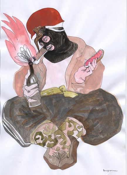 Editor: So this drawing, "Notre Dame Fighting Irish College Football Illustration," dates from around 1990 and is by Jack Davis. It’s… energetic, to say the least! A really boisterous image, full of movement. What strikes you when you look at it? Curator: The caricature speaks volumes. It's not just about depicting a football player; it’s about embodying a collective identity. The figure wears symbols – the Fighting Irish mascot, the football gear – almost as talismans. How do these symbols play into the cultural memory of college football, do you think? Editor: I guess they're instant identifiers, right? You see the Leprechaun hat, the shamrock, the uniform, and you instantly know what team is being represented. It's a shorthand. Curator: Exactly! The symbols are a concentrated burst of shared history and pride. Consider the aggressive pose; it reflects more than just athletic prowess. What does that upward-pointing finger mean to you? Is it confidence? Is it dominance? Editor: Maybe a little bit of both? And the pipe… that's an old stereotype, isn't it? Kind of problematic now, maybe. Curator: Indeed. It reminds us that symbols are never static. Their meanings shift and evolve. How does that shift affect the way we see this image today, versus how someone might have seen it in 1990? Editor: That's a good question. It makes you think about how our perceptions are always changing the meaning of an artwork. Curator: Precisely. And it's these layers of cultural encoding that make visual images such powerful carriers of meaning across time. Editor: It's really interesting to consider how much an image like this can communicate about cultural identity, even beyond just being a sports illustration. Thanks!