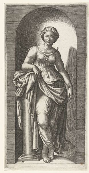 Editor: So, here we have "Fortitude" by Marcantonio Raimondi, created sometime between 1510 and 1520. It’s an engraving, showing a woman personifying strength, leaning casually on a column. I'm struck by the artist's detailed rendering of the fabric. What do you see in this piece? Curator: What interests me immediately is the process of reproduction itself. Raimondi was instrumental in popularizing engraving, which democratized art through multiplication. Think about the socio-economic implications: images previously confined to the wealthy could now circulate more widely. How does this shift in material accessibility challenge traditional notions of artistic value, tied as they were to uniqueness and authorship? Editor: That’s fascinating! I hadn’t thought about the printmaking process that way, more in terms of copying famous paintings. But if prints are a commodity, does that change our understanding of the subject? Does “Fortitude” become something you can buy, possess, and therefore *use*, rather than just admire? Curator: Precisely! We have to consider the relationship between production, consumption, and meaning. Engravings like this weren't simply aesthetic objects; they were commodities embedded in a developing market. Did the act of owning a print of 'Fortitude' influence the owner’s understanding or performance of that virtue, linking it to the emerging capitalist ideals? Editor: It gives new meaning to "possessing" a virtue! So, rather than just looking at the image, we’re examining the material conditions that allowed the image to exist and circulate. Curator: Exactly. It's not simply *what* is depicted, but *how* it was made and *who* had access to it that truly shapes the work’s impact. Considering these material factors can unlock a far richer understanding. Editor: I'll definitely look at art differently now. It’s not just the subject, but also about production and access and even economics. Thanks!