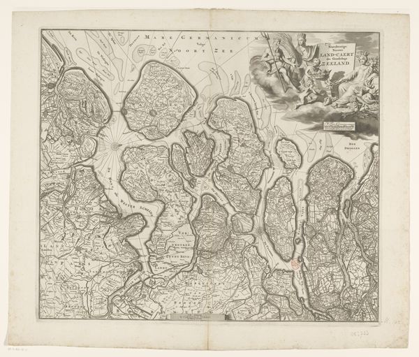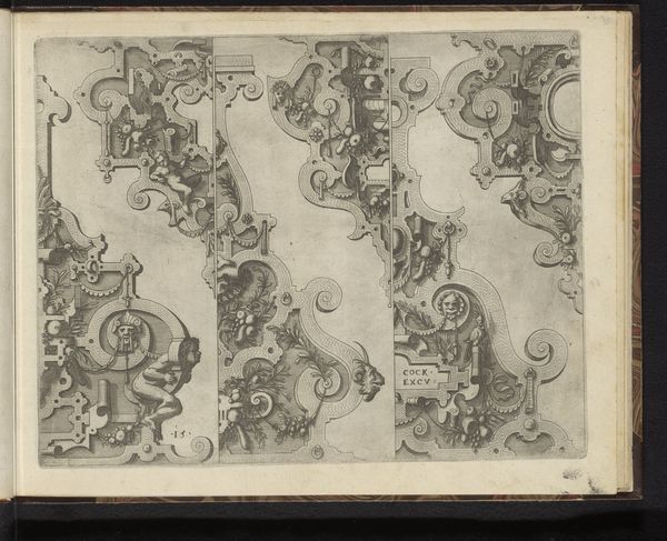 Editor: So, here we have "Plafondschildering met grotesken," a ceiling design with grotesque elements, by Lorenz Beger, made between 1687 and 1725. It’s an engraving... a pen drawing, really, and the detail is incredible! It almost feels like looking at an architectural blueprint of someone's wildest dream. How do you interpret this work, especially considering its historical context? Curator: What strikes me is how this drawing acts as a repository of power and social performance. We must examine the Baroque period it emerged from; it was a time of immense social stratification, with the aristocracy solidifying its dominance through displays of wealth and culture. The grotesque elements are telling. Editor: Grotesque how? Curator: Grotesque not in a modern, monstrous sense, but as a deliberate mixing of the natural and artificial. Think of the putti intertwined with the stylized foliage, the melding of human, animal, and plant forms. What might this suggest about the Baroque worldview? Editor: Well, perhaps a desire to exert control over nature? Curator: Precisely! These elaborate decorations, often commissioned by the elite, visually communicate their authority. They curate their world, quite literally framing the spaces inhabited by the rising merchant class as a domain defined by an older guard invested in this social hierarchy. It becomes a potent symbol of ideological control during a time of rapid societal change. What happens when styles and art production are gate-kept, then? Editor: Right, by restricting these styles, there is an active erasure happening, silencing different voices in favor of only a select view. It’s interesting to view something decorative and opulent like this as a statement on social and political status. I never thought of it that way! Curator: Exactly. It’s crucial to remember that art isn't created in a vacuum. Each element in this image carries its own weight of history and ideology. Editor: Thanks for pointing that out! I am definitely walking away thinking of engravings, and the whole Baroque style, with a different eye.