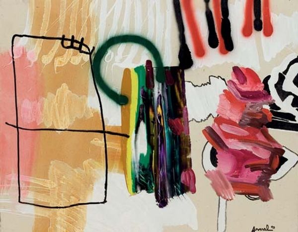 Curator: This is Billy Childish’s "Smoking Soldier," completed in 2014, and rendered with acrylic on canvas. Editor: It strikes me as… raw. Almost violent in its energy. The colours are stark and smeared, and the figure seems to be disintegrating before our eyes. Curator: Childish is very interested in the figure of the outsider. His paintings often depict marginalised figures, probing questions of power, authority, and alienation. The soldier, in this context, can be seen as emblematic of state-sponsored violence and trauma. Editor: That red of the helmet is very assertive. Is it meant to evoke the color of aggression, dominance, or perhaps sacrifice? The dripping paint adds to a sense of urgency—the idea of something bleeding, both literally and figuratively. The white drips almost look like tears or a kind of cleansing? Curator: You're noticing a crucial dynamic. He paints with a directness that borders on aggression, but then the use of white almost suggests a contradictory effort toward purification or redemption. This resonates with a longer tradition of depicting soldiers as simultaneously victims and perpetrators. It seems crucial to explore the representation of masculinities within military and its discontents, too. Editor: So, by representing this soldier, stripped down and vulnerable, he is challenging stereotypical heroic representations? Exposing the human cost beneath the uniform? I find the title interesting, also. Smoking is about oral fixation, something rudimentary in terms of psychoanalysis, which speaks to some regression in the image. Curator: Precisely. The everyday gesture of smoking becomes a symbol of anxiety, addiction, and coping mechanisms. It serves to disrupt traditional military portraiture and introduce more nuanced perspectives. We can also discuss the intersections between masculinity and violence more openly through images like these. Editor: Yes, this raw visual language has an emotive power of authenticity, inviting us to reckon with some uncomfortable realities. Thank you! Curator: Thank you.