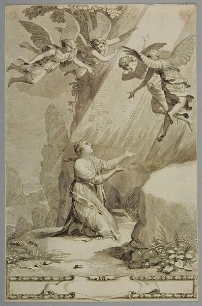 Editor: This is Giovanni Cattini's "Annunciation," an engraving from 1740. There's such a stark contrast between light and shadow, it makes the scene feel almost dreamlike...like it is unfolding in another dimension. What do you see when you look at it? Curator: It whisks me away to a time when faith danced hand-in-hand with art, doesn't it? Notice how the lines, so meticulously carved, create this swirling, ethereal feel? It’s as if the divine light is almost a tangible force. The artist, for me, is not merely illustrating a biblical story; it feels deeply felt and intuitively rendered, almost as if it sprung from the artist’s very dreams. Don't you feel that direct connection? Editor: Definitely. It's interesting you say dreams, because the scene looks so... fragile? Like it could evaporate any second. The etching almost seems to vibrate. Curator: Yes! Like a fleeting moment captured in time! And look at Mary’s pose – so humble, yet so receptive. Cattini uses this fantastic visual language that echoes through Baroque art; that delicate balance between human emotion and the grandness of the divine. Where do *you* think that delicate line takes you? Editor: I hadn’t thought of that juxtaposition exactly, but I see what you mean now. It's this incredibly intimate scene set against what's clearly a monumental, heavenly event. It does pull you in two directions. Curator: Exactly. It’s a meditation on acceptance, faith, and the transformative power of a single moment. I believe there is a whole personal and vulnerable element to this. You’re right about its fragile quality. A whisper translated into image. Editor: That makes a lot of sense. I’ll never look at another Annunciation quite the same way! Curator: Fantastic. Perhaps we are just beginning to truly *see* such masterpieces and let them enter into our consciousness.