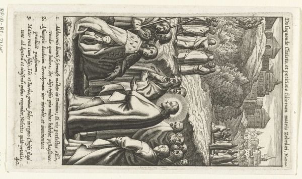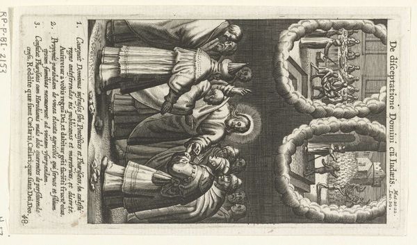 Editor: This engraving, titled "Christ Healing the Man with Dropsy" by Boëtius Adamsz. Bolswert, dates back to the early 17th century. I'm immediately struck by the level of detail achieved through etching and engraving – the artist really uses that stark contrast to create a sense of drama. What do you see in this piece, from a symbolic point of view? Curator: It's fascinating, isn't it? This image resonates deeply with the enduring tension between divine compassion and societal judgment. Notice how Christ is illuminated. That halo, of course, signifies his divinity, but it also serves to visually separate him from the darkened figures surrounding him. They are physically closer, but spiritually distant, burdened by earthly concerns. Editor: I hadn’t considered the separation like that. The way the figures are rendered, especially the Pharisees, feels almost caricatured. Curator: Exactly! Bolswert is employing a powerful visual vocabulary. The puffed-up figures of the Pharisees aren't just physical representations, but symbolic manifestations of arrogance and self-importance. Dropsy, in that context, also becomes a symbol. Consider how the physical ailment mirrors their spiritual illness, their inflated egos. Healing the man with dropsy, in a symbolic sense, is Christ combating the arrogance of the Pharisees. It's a visual debate about compassion, law, and spiritual health. Editor: That makes me see the little scenes in the upper right in a new way, now, like alternative possibilities. Curator: Precisely! It reminds us that images speak not only to the immediate subject but to a whole network of related concepts and concerns. Each viewing offers the potential for renewed understandings. Editor: Thanks, I now understand how to engage more meaningfully with the artist's representation!
