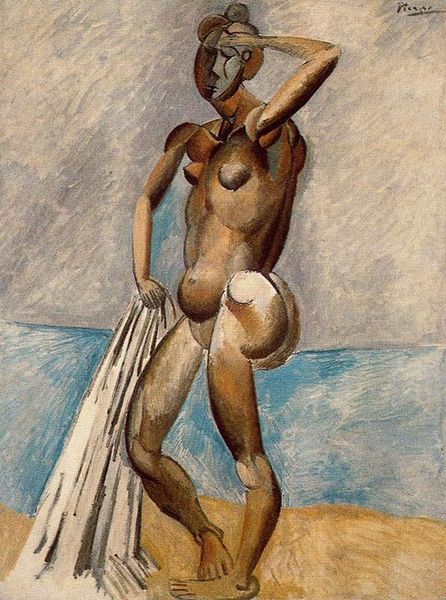 Curator: Here we have an untitled oil painting by Antonio Bueno, an intriguing take on figuration, specifically a nude figure. What are your initial thoughts? Editor: My first impression is the strong classical influence, almost neoclassical, yet rendered in a very tactile, earthy way. The framing emphasizes a sense of timelessness and enclosure, a visual echo of archaic depictions of goddesses or nymphs in niches. Curator: Precisely. Consider the classical pose. The figure with her back turned is both vulnerable and subtly powerful, evocative of Renaissance ideals, while her hairstyle calls back to Greek and Roman sculpture, reminding us of the continuous reinvention of visual memory through images. Editor: Absolutely, and Bueno's choice of color contributes. The muted ochres and browns, almost monochromatic, lend it a feeling of faded grandeur, or even an antique statue emerging from the earth. The textural treatment, where brushstrokes build volume, contradicts the polished surfaces one associates with classical art. There's a material tension there, perhaps exploring temporality and the way images are both created in, and exist through time. Curator: I agree; there's something deeply humanizing in those imperfect textures. While clearly inspired by idealized forms, the imperfections—the weight of the body, the visible brushwork—suggest a meditation on the actual body versus the ideal. Editor: What’s particularly interesting to me is how he has situated the female figure in a recess, the architectural setting giving added structural form that interacts harmoniously with the female physique and draping. Semiotically speaking, we should read the contrast as intrinsic to its beauty. Curator: These details speak to how archetypes shape our understanding and create continuity across generations of visual stories. Antonio Bueno, through this, has captured a compelling moment of transformation, or a revelation of inner being in a carefully constructed outer shell. Editor: Indeed. Examining how the subject’s gaze is oriented away from the viewer and the way it invites the observer to enter the intimate, private moment reveals an exciting conversation on the historical tradition of nudes. Curator: It is an inspiring way for us to reinterpret and engage with an ever evolving conversation.