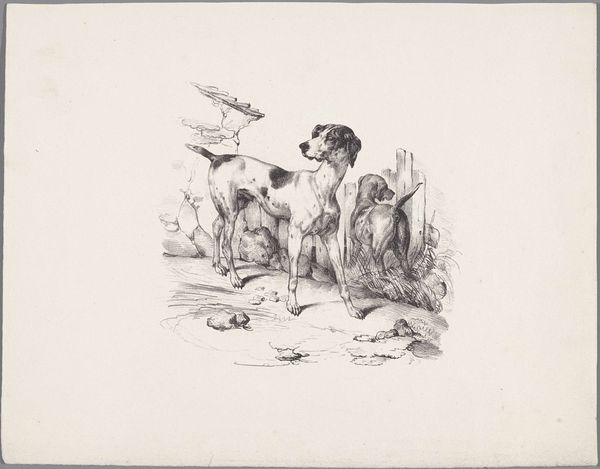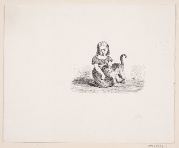 Editor: We're looking at "A Girl with a Dog" from 1869, an etching by Axel Helsted. The soft pencil work creates such a sweet and serene mood; the girl and dog seem to share a gentle moment. What strikes you most about it? Curator: Oh, isn't it charming? For me, it whispers of simpler times, of that intimate connection between humans and animals – a language understood without words. The girl, absorbed in her quiet pursuit, almost mirroring the dog’s calm watchfulness. But look closer – does the slightly melancholic haze remind you of anything? Perhaps those early photographs, clinging to a memory, a feeling… Editor: I see what you mean! There is definitely something nostalgic about it. Curator: Precisely! It feels less like a snapshot and more like a cherished dream. And the way Helsted uses light and shadow – those delicate lines barely there – hints at a fleeting moment, doesn’t it? Like capturing a sunbeam dancing on water. What do you think their story is? I feel like inventing one, like children with mud pies and grand tales. Editor: I love that idea! It makes you wonder what they're looking at so intently, almost as if the real world is secondary. Curator: Exactly! Or perhaps, dear friend, the *real* world lies precisely there, in their shared gaze, far from our noisy interpretations? Food for thought, indeed. Editor: It really is. Thanks, I'll never look at etchings the same way again! Curator: Ah, music to my ears! That is the magic, isn't it? To unlock a fresh perspective, to find the echo of oneself in lines etched long ago… Now, what marvels await us around the corner, I wonder?