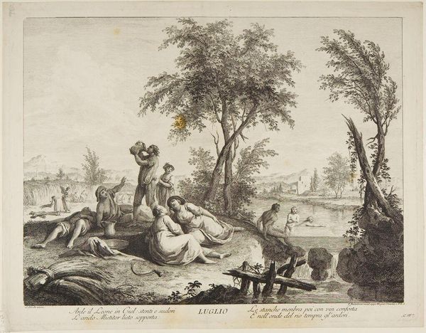 Editor: Joseph Wagner's "Landscape with Shepherds" presents a scene of pastoral life. The composition is quite striking with its contrasting dark foreground and light background. What elements of the visual structure stand out to you? Curator: Observe how the artist employs chiaroscuro. The deep shadows in the foreground, framing the figures and foliage, give way to a lighter tonality in the distant landscape. Note the deliberate contrast. Editor: Yes, the strategic use of light definitely creates depth. Are there any other key techniques that contribute to the visual impact of this engraving? Curator: Consider the linearity. The etched lines define forms but also create textures. Note the varying density of lines to simulate light and shadow, a sophisticated use of the medium. Editor: It’s fascinating how the artist achieves such detail with simple lines. I see how much I still have to learn. Curator: Indeed, the formal elements reveal a great deal about the artist's skill and the aesthetic considerations of the time.