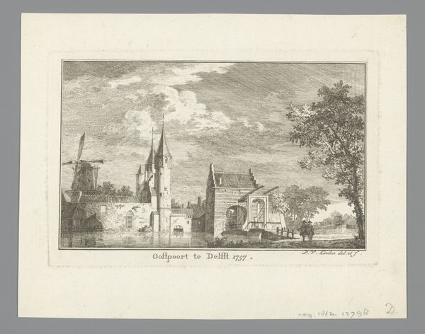 Curator: Here we have a cityscape titled "Gezicht op de Onze Lieve Vrouwekerk en toren in Amersfoort," or "View of the Church of Our Lady and Tower in Amersfoort." It's an engraving, dating back to around 1760, crafted by Paulus van Liender. Editor: It strikes me as quite serene. The delicate lines of the engraving lend a quiet formality, a gentle orderliness to the depiction of Amersfoort. It's as though the artist aimed to capture the town in a moment of composed reflection. Curator: Cityscapes in this era often served purposes beyond mere representation. Consider the symbolic weight of the church, dominating the composition. Towers, particularly church towers, acted as beacons, visually anchoring communities and projecting power and stability. The linear perspective pulls the viewer towards it. Editor: Absolutely, and it's not just about religious authority. These images are often imbued with civic pride, visual affirmations of the prosperity and stability of a city. Notice the solitary figure in the rowboat; their presence anchors the architecture with a sign of human activity and the rhythms of daily life. Curator: Precisely. Also, consider the careful attention to detail. Van Liender rendered the architecture with a precision that highlights the aspirations of the era, echoing baroque sensibilities through formal articulation. It invites viewers to contemplate not only the literal buildings, but also the collective ambition they symbolize. It emphasizes the human hand. Editor: Yet, it's also essential to recognize that this controlled, idealized image exists in dialogue with the complex social and political realities of the time. Cityscapes are often carefully curated to omit anything deemed undesirable, like poverty or social unrest. Curator: Very true. The engraving becomes a powerful tool, shaping how viewers perceived—and ideally, remembered—the urban landscape. So what's left are only things that have social license to be seen or accepted. Editor: Yes. A calculated statement of a particular perspective, where what isn't shown speaks as loudly as what is. It also acts as a precursor to modern marketing, selling an idealized version of communal life to the wealthy urban elite. Curator: These visual texts are a great entry point into interrogating our collective memory. Thank you for helping me to uncover the hidden symbols. Editor: Thank you. That gives one quite a bit to reflect on in a deceptively simple city view.